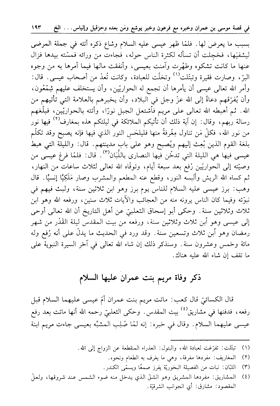 بسبب ما يعرض لها . فلما ظهر عيسى - ع - وشاع ذكره أتته في جملة المرضى ليشفيها ، فخجلت أن تسأله لكثرة الناس حوله ، فجاءت من ورائه فمسته بيدها فزال عنها ما كانت تشكوه وطهرت وآمنت بعيسى ، وأنفقت مالها فيما أمرها به من وجوه البر ، وصارت فقيرة وتبتلت وتخلت للعبادة ، وكانت تعد من أصحاب عيسى . قال : وأمر الله تعالى عيسى أن يأمرها أن تجمع له الحواريين ، وأن تستخلف عليهم شمعون ، وأن يفرقهم دعاة إلى الله عز وجل في البلاد ، وأن يخبرهم بالعلامة التي تأتيهم من الله . ثم أهبطه الله تعالى على مريم فاشتعل الجبل نوراً ، وأتته بالحواريين ، فبلغهم رسالة ربهم ، وقال : إن آية ذلك أن تأتيكم الملائكة في ليلتكم هذه بمغارف فيها نور من نور الله ، فكل من تناول مغرفة منها فليلحس النور الذي فيها فإنه يصبح وقد تكلم بلغة القوم الذين بعث إليهم ويصبح وهو على باب مدينتهم . قال : والليلة التي هبط عيسى فيها هي الليلة التي تدخن فيها النصارى باللبان . قال : فما فرغ عيسى من وصيته إلى الحواريين رفع بعد سبعة أيام ، وتوفاه الله تعالى لثلاث ساعات من النهار ، ثم كساه الريش وألبسه النور ، وقطع عنه المطعم والمشرب وصار ملكياً إنسياً . قال وهب : برز عيسى - ع - للناس يوم برز وهو ابن ثلاثين سنة ، ولبث فيهم في نبوته وفيما كان الناس يرونه منه من العجائب والآيات ثلاث سنين ، ورفعه الله وهو ابن ثلاث وثلاثين سنة . وحكى أبو إسحاق الثعلبي عن أهل التاريخ أن الله تعالى أوحى إلى عيسى وهو ابن ثلاث وثلاثين سنة ، ورفعه من بيت المقدس ليلة القدر من شهر رمضان وهو ابن ثلاث وتسعين سنة . وقد ورد في الحديث ما يدل على أنه رفع وله مائة وخمس وعشرون سنة . وسنذكر ذلك إن شاء الله تعالى في آخر السيرة النبوية على ما تقف إن شاء الله عليه هناك .