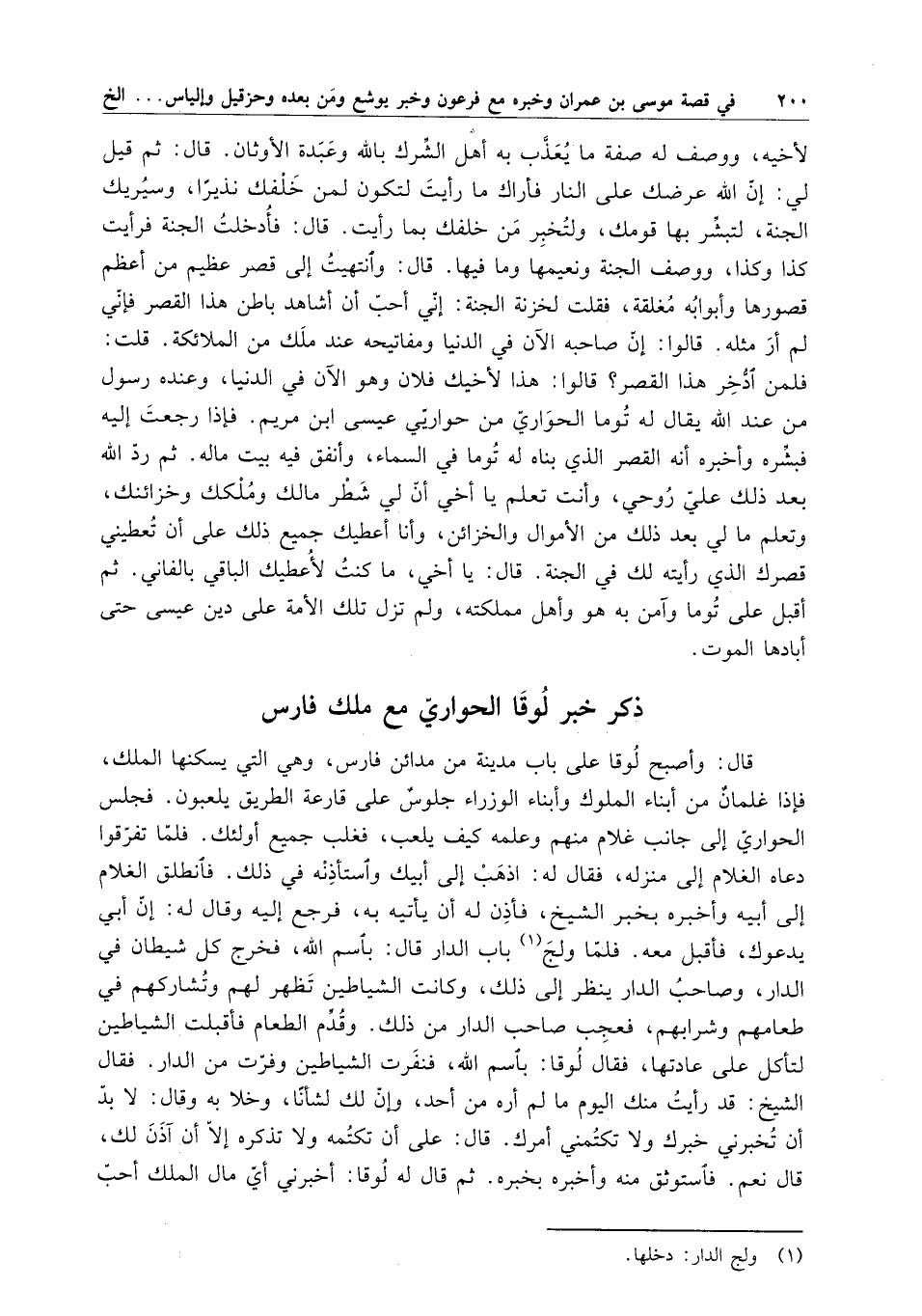 لأخيه ، ووصف له ما يعذب به أهل الشرك باله وعبدة الأوثان . قال : ثم قيل لي : إن الله عرضك على النار فأراك ما رأيت لتكون ملن خلفك نذيراً ، وسيريك الجنة ، لتبشر بها قومك ، ولتخبر من خلقك بما رأيت . قال : فأدخلت الجنة فرأيت كذا وكذا ، ووصف الجنة ونعيمها وما فيها . قال : وانتهيت إلى قصر عظيم من أعظم قصورها وأبوابه مغلقة ، فقلت لخزنة الجنة : إني أحب أن أشاهد باطن هذا القصر فإني لم أر مثله . قالوا : إن صاحبه الآن في الدنيا ومفاتيحه عند ملك من الملائكة . قلت : فلمن ادخر هذا القصر ؟ قالوا : هذا لأخيك فلان وهو الآن في الدنيا ، وعنده رسول من عند الله يقال له توما الجواري من حواريى عيسى بن مريم . فإذا رجعت إليه فبشره وأخبره أنه القصر الذي بناه له توما في السماء ، وأنفق فيه بيت ماله . ثم رد الله بعد ذلك على روحي ، وأنت تعلم يا أخي أن لي شطر مالك وملكك وخزائنك ، وتعلم ما لي بعد ذلك من الأموال والخزائن ، وأنا أعطيك جميع ذلك على أن تعطيني قصرك الذي رأيته لك في الجنة . قال : يا أخي ، ما كنت لأعطيك الباقي بالفاني . ثم أقبل على توما وآمن به هو وأهل مملكته ، ولم تزل تلك الأمة على دين عيسى حتى أبادها الموت .