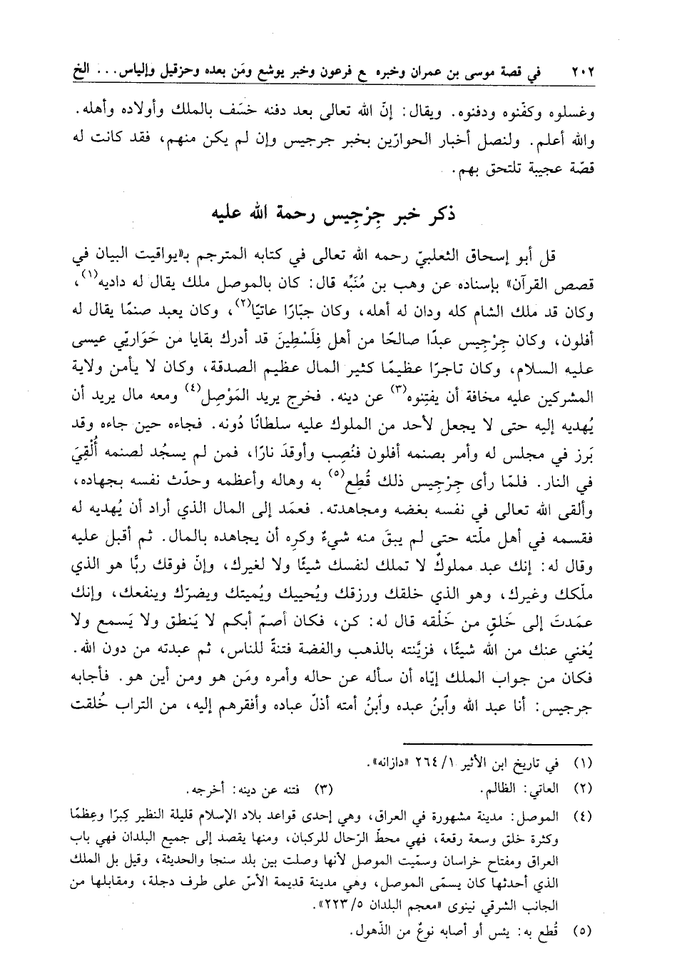 قال أبو إسحاق الثعلبي رحمه الله تعالى في كتابه المترجم بيواقيت البيان في قصص القرءان بإسناده عن وهب بن منبه قال : كان بالموصل ملك يقال له داديه ، وكان قد ملك الشام كله ودان له أهله ، وكان جباراً عاتياً ، وكان يعبد صنماً يقال له أفلون ، وكان جرجيس عبداً صالحاً من أهل فلسطين قد أدرك بقايا من حواريى عيسى - ع - ، وكان تاجراً عظيماً كثير المال عظيم الصدقة ، وكان لا يأمن ولاية المشركين عليه مخاف أن يفتنوه عن دينه . فخرج يريد الموصل ومعه مال يريد أن يهديه إليه حتى لا يجعل لأحد من الملوك عليه سلطاناً دونه . فجاءه حين جاءه وقد برز في مجلس له وأمر بصنمه أفلون فنصب وأوقد ناراً ، فمن لم يسجد لصنمه ألقي في النار . فلما رأى جرجيس ذلك قطع به وهاله وأعظمه وحدث نفسه بجهاده ، وألقى الله تعالى في نفسه بغضه ومجاهدته . فعمد إلى المال الذي أراد أن يهديه له فقسمه في أهل ملته حتى لم يبق منه شيء وكره أن يجاهده بالمال . ثم أقبل عليه وقال له : إنك عبد مملوك لا تملك لنفسك شيئاً ولا لغيرك ، وإن فوقك رباً هو الذي ملكك وغيرك ، وهو الذي خلقك ورزقك ويحييك ويميتك ويضرك وينفعك ، وإنك عمدت إلى خلق من خلقه قال له : كن ، فكان أصم أبكم لا ينطق ولا يسمع ولا يغني عنك من الله شيئاً ، فزينته بالذهب والفضة فتنة للناس ، ثم عبدته من دون الله . فكان من جواب الملك إياه أن سأله عن حاله وأمره ومن هو ومن أين هو . فأجابه جرجيس : أنا عبد الله وابن عبده وابن أمته أذل عباده وأفقرهم إليه ، من التراب خلقت