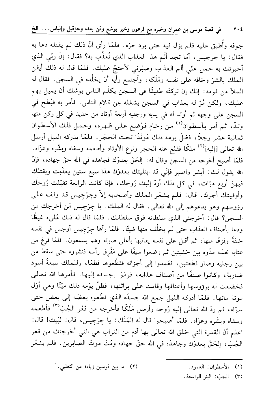 جوفه وأطبق عليه فلم يزل فيه حتى برد حره . فلما رأى أن ذلك لم يقتله دعا به فقال : يا جرجيس ، أما تجد ألم هذا العذاب الذي تعذب به ؟ فقال : إن ربي الذي أخبرتك به حمل عني ألم العذاب وصبرني لأحتج عليك . فلما قال له ذلك أيقن الملك بالشر وخافه على نفسه وملكه ، واجتمع رأيه أن يخلده في السجن . فقال له الملأ من قومه : إنك إن تركته طليقاً في السجن يكلم الناس يوشك أن يميل بهم عليك ، ولكن مر له بعذاب في السجن يشغله عن كلام الناس . فأمر به فبطح في السجن على وجهه ثم أوتد له في يديه ورجليه أربعة أوتاد من حديد في كل ركن منها وتد . ثم أمر بأسطوان من رخام فوضع على ظهره ، وحمل ذلك الأسطوان ثمانية عشر رجلاً ، فظل يومه ذلك موتداً تحت الحجر . فلما أدركه الليل أرسل الله تعالى إليه ملكاً فقلع عنه الحجر ونزع الأوتاد وأطعمه وسقاه وبشره وعزاه . فلما أصبح أخرجه من السجن وقال له : الحق بعدوك فجاهده في الله حق جهاده ، فإن الله يقول لك : أبشر واصبر فإني قد ابتليتك بعدوك هذا سبع سنين يعذبك ويقتلك فيهن أربع مرات ، في كل ذلك أرد إليك روحك ، فإذا كانت الرابعة تقبلت روحك وأوفيتك أجرك . قال : فلم يشعر