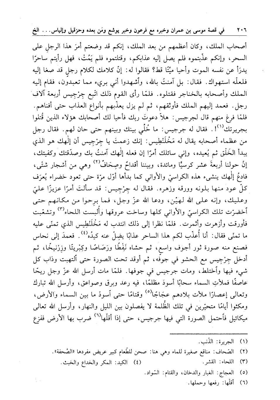 أصحاب الملك ، وكان أعظمهم من بعد الملك ، إنكم قد وضعتم أمر هذا الرجل على السحر ، وإنكم عذبتموه فلم يصل إليه عذابكم ، وقتلتموه فلم يمت ، فهل رأيتم ساحراً يدرأ عن نفسه الموت وأحيا ميتاً قط ؟ فقالوا له : إن كلامك رجل قد صغا إليه فلعله استهواك . فقال : بل آمنت بالله ، واشهدوا أني بريء مما تعبدون فقام إليه الملك وأصحابه بالخناجر فقتلوه . فلما رأى القوم ذلك اتبع جرجيس أربعة آلاف رجل . فعمد إليهم الملك فأوثقهم ، ثم لم يزل يعذبهم بأنواع العذاب حتى أفناهم . فلما فرغ منهم قال لجرجيس : هلا دعوت ربك فأحيا لك أصحابك هؤلاء الذي قتلوا بجريرتك . فقال له جرجيس : ما خلى بينك وبينهم حتى حان لهم . فقال رجل من عظماء أصحابه يقال له مخلنطيس : إنك زعمت يا جرجيس أن إلهك هو الذي يبدأ الخلق ثم يعيده ، وإني سائلك أمراً إن فعله إلهك آمنت بك وصدقتك وكفيتك ، إن حولنا أربعة عشر كرسياً ومائدة ، وبيننا أقداح وصحاف وهي من أشجار شتى ، فادع إلهك ينشء هذه الكراسي والأواني كما بدأها أول مرة حتى تعود خضراء يعرف كل عود منها بلونه وورقه وزهره . فقال له جرجيس : قد سألت أمراً عزيزاً علي وعليك ، وإنه على الله لهين ، ودعا الله عز وجل ، فما برحوا من مكانهم حتى اخضرت تلك الكراسي والأواني كلها وساخت عروقها وألبست اللحاء وتشعبت فأورقت وأزهرت وأثمرت . فلما نظروا إلى ذلك انتدب له مخلنطيس الذي تمنى عليه ما تمنى فقال : أنا أعذب لكم هذا الساحر عذاباً يضل عنه كيده . فعمد إلى نحاس فصنع منه صورة ثور أجوف واسع ، ثم حشاه نفطاً ورصاصاً وكبريتاً وزرنيخاً ، ثم أدخل جرجيس مع الحشو في جوفه ، ثم أوقد تحت الصورة حتى التهبت وذاب كل شيء فيها واختلط ، ومات جرجيس في جوفها . فلما مات أرسل الله عز وجل ريحاً عاصفاً فملأت السماء سحاباً أسود مظلماً ، فيه رعد وبرق وصواعق ، وأرسل الله تبارك وتعالى اعصاراً ملأت بلادهم عجاجاً وقتاماً حتى اسود ما بين السماء والأرض ومكثوا أياماً متحيرين في تلك الظلمة لا يفصلون بين الليل والنهار ، وأرسل الله تعالى ميكائيل فاحتمل الصورة التي فيها جرجيس ، حتى إذا أقلها ضرب بها الأرض ففزع