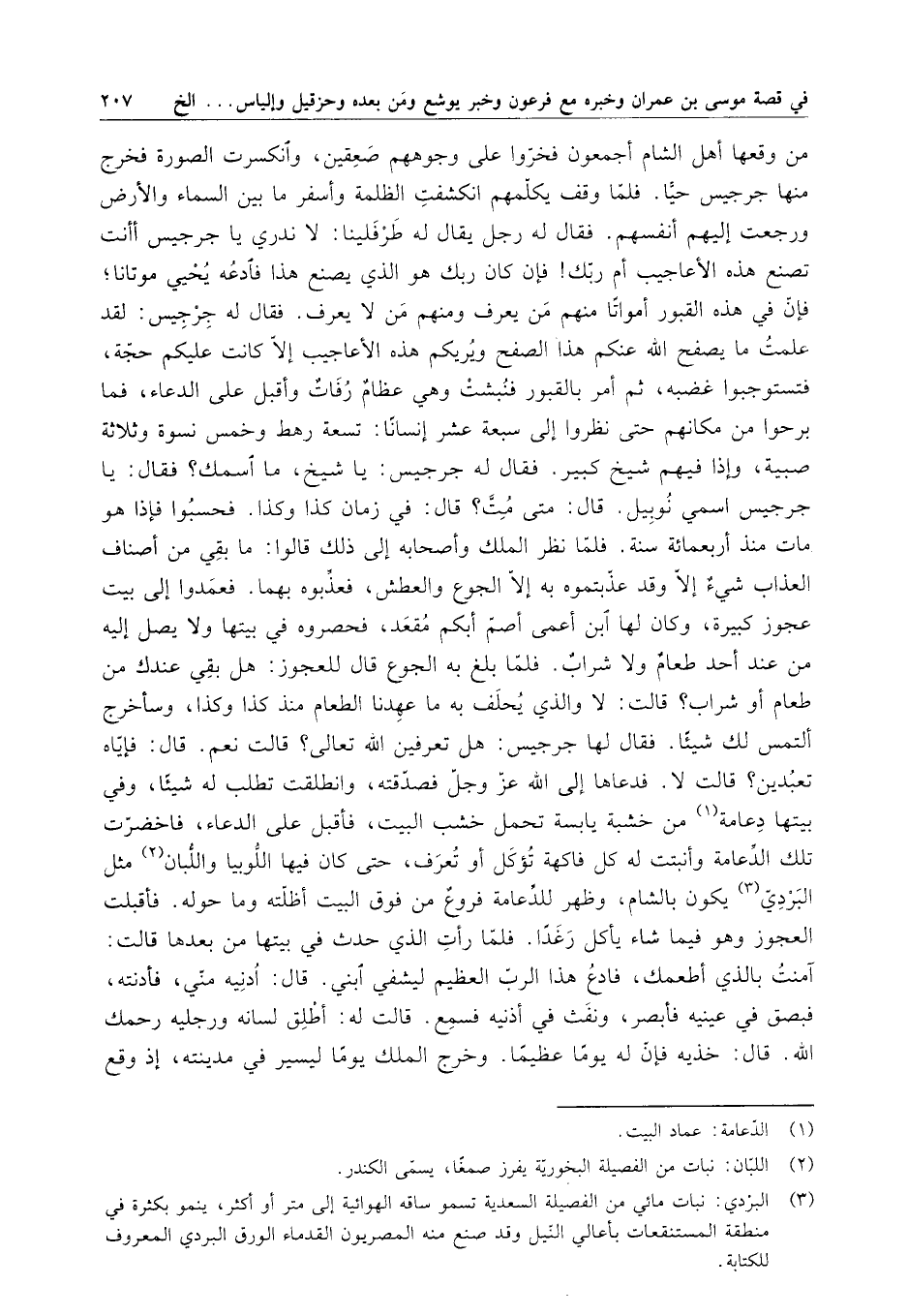 من وقعها أهل الشام أجمعون فخروا على وجوههم صعقين ، وانكسرت الصورة فخرج منها جرجيس حياً . فلما وقف يكلمهم انكشفت الظلمة وأسفر ما بين السماء والأرض ورجعت إليهم أنفسهم . فقال له رجل يقال له طرفلينا : لا ندري يا جرجيس أأنت تصنع هذه الأعاجيب أم ربك فإن كان ربك هو الذي يصنع هذا فادعه يحيى موتانا ؛ فإن في هذه القبور أمواتاً منه من يعرف ومنهم من لا يعرف . فقال له جرجيس : لقد علمت ما يصفح الله عنكم هذا الصفح ويريكم هذه الأعاجيب إلا كانت عليكم حجة ، فتستوجبوا غضبه ، ثم أمر بالقبور فنبشت وهي عظام رفات وأقبل على الدعاء ، فما برحوا من مكانهم حتى نظروا إلى سبعة عشر إنساناً : تسعة رهط وخمس نسوة وثلاثة صبية ، وإذا فيهم شيخ كبير . فقال له جرجيس : يا شيخ ، ما اسمك ؟ فقال : يا جرجيس اسمي نوبيل . قال : متى مت ؟ قال : في زمان كذا وكذا . فحسبوا فإذا هو مات منذ أربعمائة سنة . فلما نظر الملك وأصحباه إلى ذلك قالوا : ما بقي من أصناف العذاب شيء إلا وقد عذبتموه به إلا الجوع والعطش ، فعذبوه بهما . فعمدوا إلى بيت عجوز كبيرة ، وكان لها ابن أعمى أصم أبكم مقعد ، فحصروه في بيتها ولا يصل إليه من عند أحد طعام ولا شراب . فلما بلغ به الجوع قال للعجوز : هل بقي عندك من طعام أو شراب ؟ قالت : لا والذي يحلف به ما عهدنا الطعام منذ كذا وكذا ، وسأخرج ألتمس لك شيئاً . فقال لها جرجيس : هل تعرفين الله تعالى ؟ قالت نعم . قال : فإياه تعبدين ؟ قالت لا . فدعاها إلى الله عز وجل فصدقته ، وانطلقت تطلب له شيئاً ، وفي بيتها دعامة من خشبة يابسة تحمل خشب البيت ، فأقبل على الدعاء ، فاخضرت تلك الدعامة وأنبتت له كل فاكهة تؤكل أو تعرف ، حتى كان فيا اللوبيا واللبان مثل البردى يكون بالشام ، وظهر للدعامة فروع من فوق البيت أظلته وما حوله . فأقبلت العجوز وهو فيما شاء يأكل رغداً . فلما رأت الذي حدث في بيتها من بعدها قالت : آمنت بالذي أطعمك ، فادع هذا الرب العظيم ليشفى ابني . قال : ادنيه مني ، فأدنته ، فبصق في عينيه فأبصر ، ونفث في أذنيه فسمع . قالت له : أطلق لسانه ورجليه رحمك الله . قال : خذيه فإن له يوماً عظيماً . وخرج الملك يوماً ليسر في مدينته ، إذ وقع