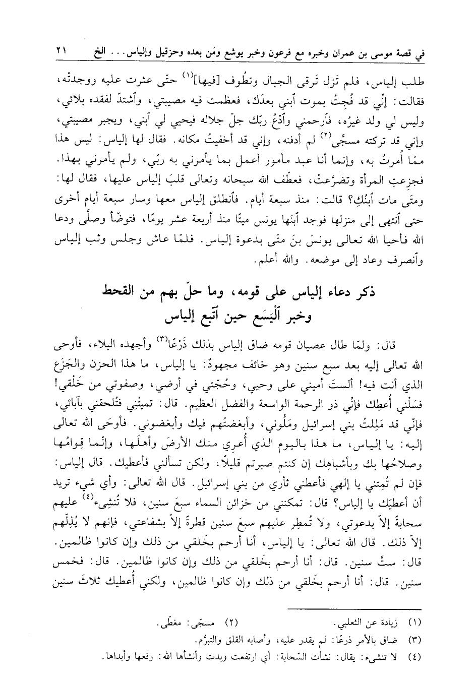 قال : ولما طال عصيان قومه ضاق إلياس بذلك درعاً وأجهده البلاء ، فأوحى الله تعالى إليه بعد سبع سنين وهو خائف مجهود : يا إلياس ، ما هذا الحزن والجزع الذي أنت فيه ألست أمين على وحيي ، وحجتي في أرضي ، وصفوتي من خلقي فسلني أعطك فإني ذو الرحمة الواسعة والفضل العظيم . قال : تميتني فتلحقني بآبائي ، فإني قد مللت بني إسرائيل وملوني ، وأبغضتهم فيك وأبغضوني . فأوحى الله تعالى إليه : يا إلياس ، ما هذا باليوم الذي أعرى منك الأرض وأهلها ، وإنما قوامها وصلاحها بك وبأشباهك إن كنتم صبرتم قليلاً ، ولكن تسألني فأعطيك قال إلياس : فإن لم تمتني يا إلهي فأعطني ثأري من بني إسرائيل . قال الله تعالى وأي شيء تريد أن أعطيك يا إلياس ؟ قال : تمكنني من خزائن السماء سبع سنين ، فلا تنشئ عليهم سحابة إلا بدعوتي ، ولا تمطر عليهم سبع سنين قطرة إلا بشفاعتي ، فإنهم لا يذلهم إلا ذلك . قال الله تعالى : يا إلياس ، أنا أرحم بخلقي من ذلك وإن كانوا ظالمين . قال : ست سنين . قال : أنا أرحم بخلقي من ذلك وإن كانوا ظالمين . قال : فخمس سنين . قال : أنا أرحم بخلقي من ذلك وإن كانوا ظالمين ، ولكني أعطيك ثلاث سنين