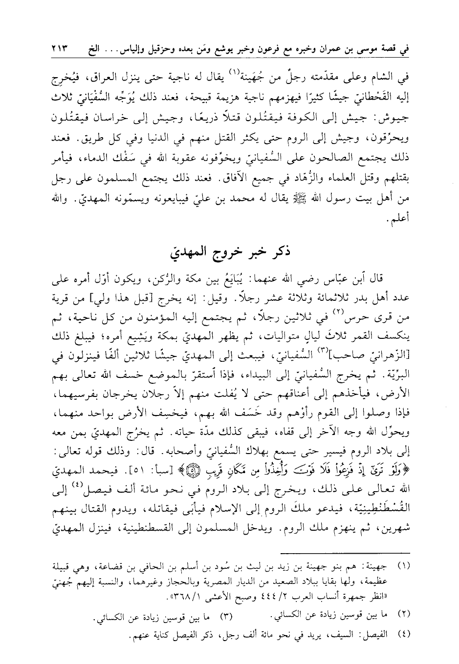 في الشام وعلى مقدمته رجل من جهينة يقال له ناجية حتى ينزل العراق ، فيخرج إليه القحطاني جيشاً كثيراً فيهزمهم ناجية هزيمة قبيحة ، فعند ذلك يوجه السفياني ثلاث جيوش : جيش إلى الكوفة فيقتلون قتلاً ذريعاً ، وجيش إلى خراسان فيقتلون ويحرقون ، جيش إلى الروم حتى يكثر القتل منهم في الدنيا وفي كل طريق . فعند ذلك يجتمع الصالحون على السفياني . ويخوفونه عقوبة الله في سفك الدماء ، فيأمر بقتلهم وقتل العلماء والزهاد في جميع الآفاق . فعند ذلك يجتمع المسلمون على رجل من أهل بيت رسول الله ( صلى الله عليه وسلم ) يقال له محمد بن علي فيبايعونه ويسمونه المهدي . والله أعلم .