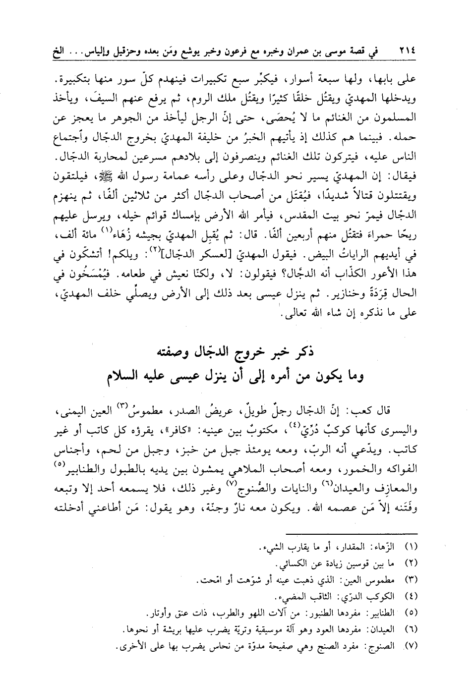 على بابها ، ولها سبعة أسوار ، فيكبر سبع تكبيرات فينهدم كل سور منها بتكبيرة . ويدخلها المهدي ويقتل خلقاً كثيراً ويقتل ملك الروم ، ثم يرفع عنهم السيف ، ويأخذ المسلمون من الغنائم ما لا يحصى ، حتى إن الرجل ليأخذ من الجوهر ما يعجز عن حمله . فبينما هم كذلك إذ يأتيهم الخبر من خليفة المهدي بخروج الدجال واجتماع الناس عليه ، فيتركون تلك الغنائم وينصرفون إلى بلادهم مسرعين لمحاربة الدجال . فيقال : إن المهدي يسير نحو الدجال وعلى رأسه عمام رسول الله ( صلى الله عليه وسلم ) ، فيلتقون ويقتتلون قتالاً شديداً ، فيقتل من أصحاب الدجال أكثر من ثلاثين ألفاً ، ثم ينهزم الدجال فيمر نحو بيت المقدس ، فيأمر الله الأرض بإمساك قوائم خيله ، ويرسل عليهم ريحاً حمراء فتقتل منهم أربعين ألفاً . قال : ثم يقبل المهدي بجيشه زهاء مائة ألف ، في أيديهم الرايات البيض . فيقول المهدي لعسكر الدجال : ويلكم أتشكون في هذا الأعور الكذاب أنه الدجال ؟ فيقولون : لا ، ولكنا نعيش في طعامه . فيمسخون في الحال قردة وخنازير . ثم ينزل عيسى بعد ذلك إلى الأرض ويصلي خلف المهدي ، على ما نذكره إن شاء الله تعالى .