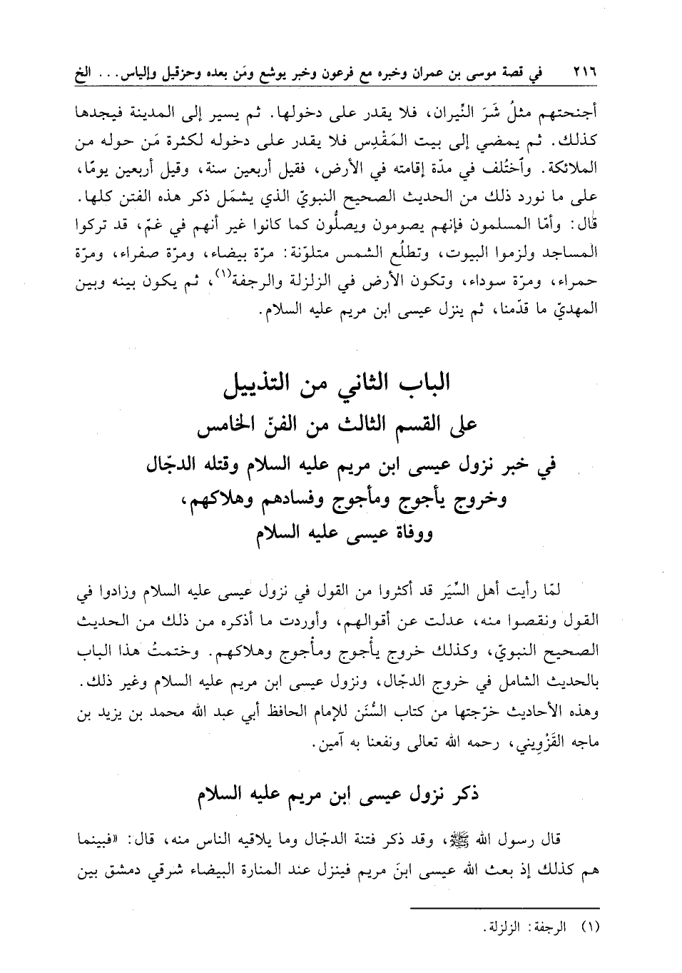 الباب الثاني من التذييل على القسم الثالث من الفن الخامس في خبر نزول عيسى بن مريم عليه السلام وقتله الدجال وخروج يأجوج ومأجوج وفسادهم وهلاكهم ، ووفاة عيسى عليه السلام