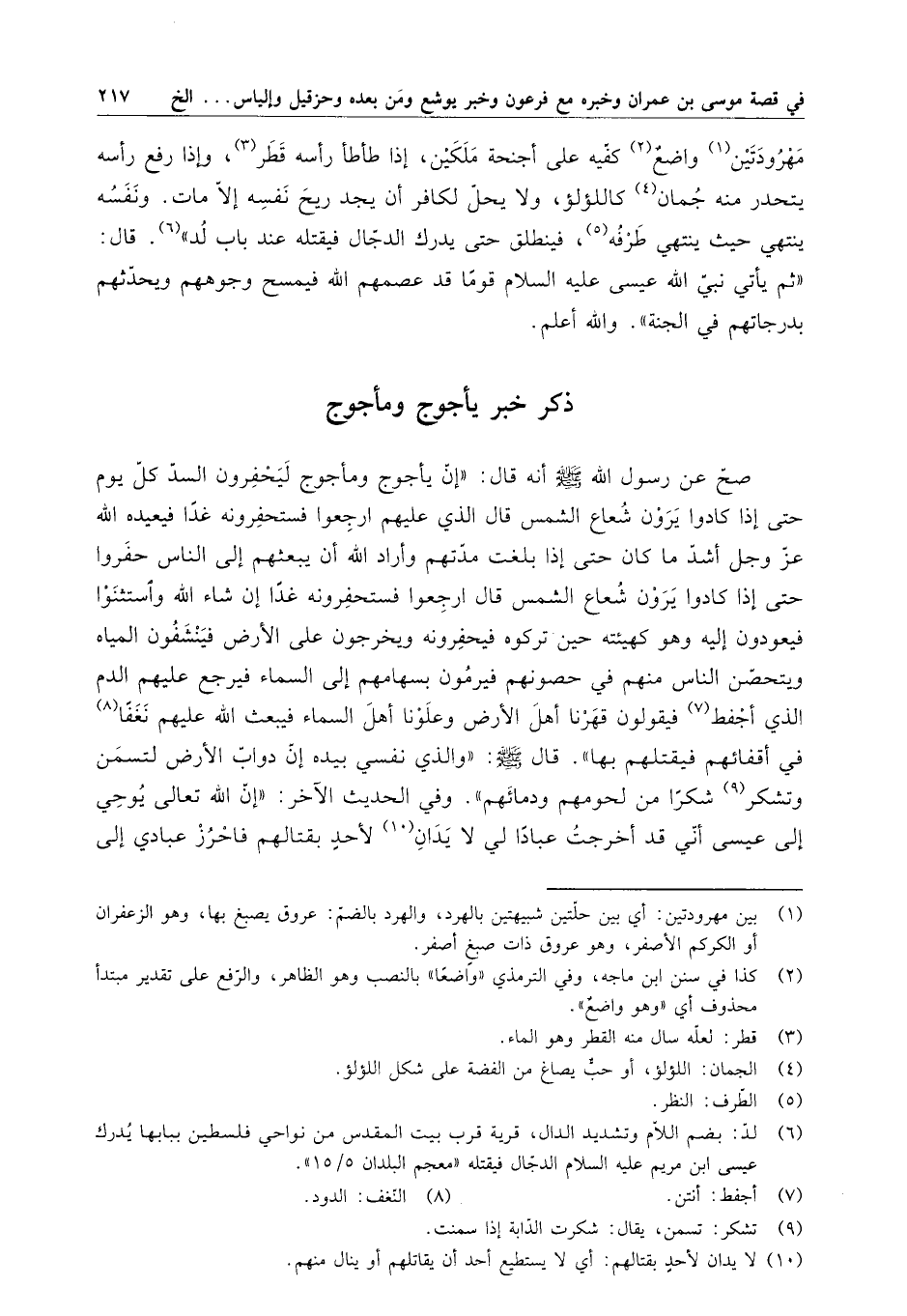 مهرودتين واضع كفيه على أجنحة ملكين ، إذا طأطأ رأسه قطر ، وإذا رفع رأسه يتحدر منه جمان كاللؤلؤ ، ولا يحل لكافر أن يجد ريح نفسه إلا مات . ونفسه ينتهي حيث ينتهي طرفه ، فينطلق حتى يدرك الدجال فيقتله عند باب لد " . قال : " ثم يأتي نبي الله عيسى - ع - قوماً قد عصمهم الله فيمسح وجوههم ويحدثهم بدرجاتهم في الجنة " . والله أعلم .
