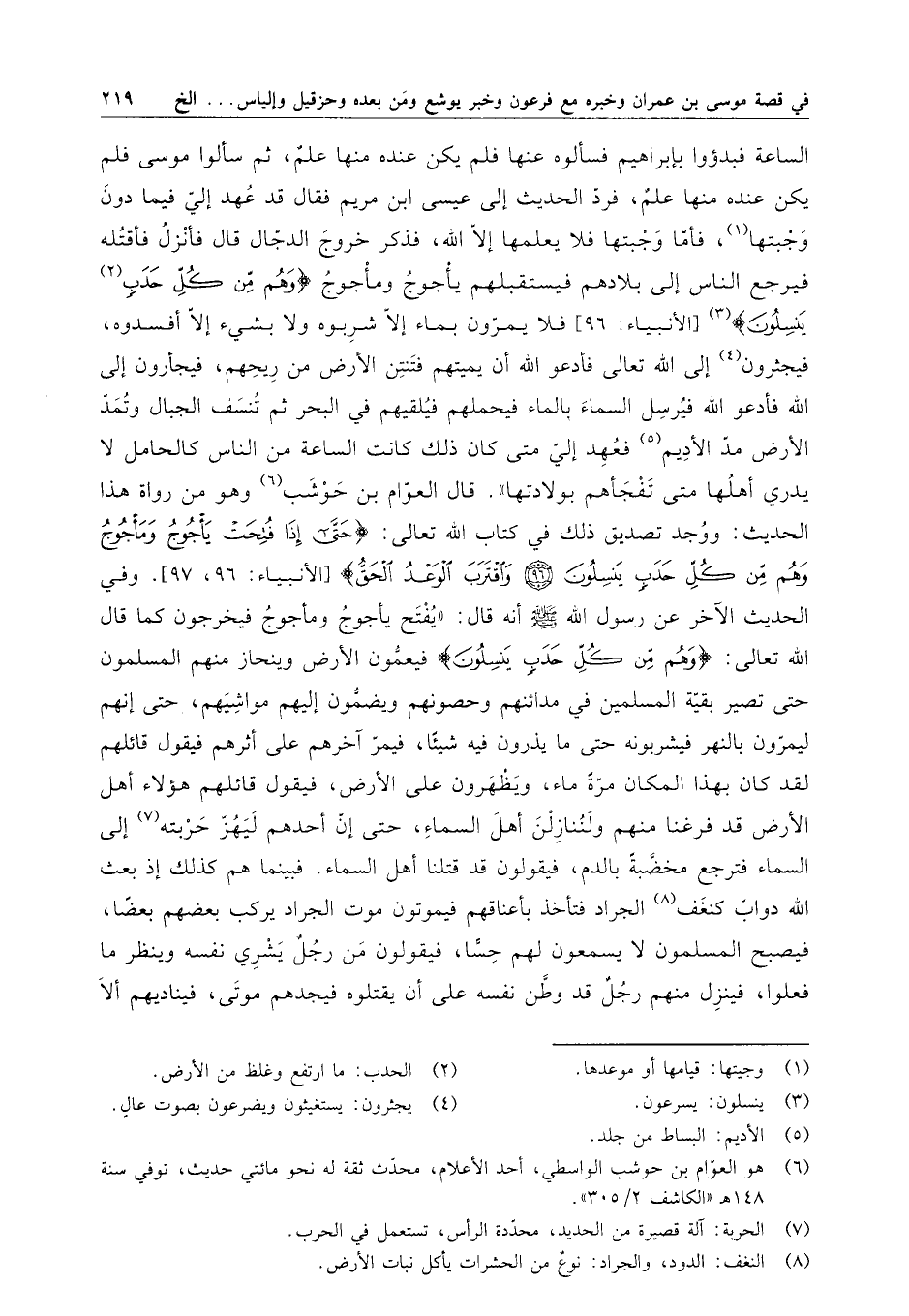 الساعة فبدءوا بإبراهيم فسألوه عنها فلم يكن عنده منها علم ، ثم سألوا موسى فلم يكن عنده منها علم ، فرد الحديث إلى عيسى بن مريم فقال قد عهد إلي فيما دون وجبتها ، فأما وجبتها فلا يعلمها إلا الله ، فذكر خروج الدجال قال فأنزل فأقتله فيرجع الناس إلى بلادهم فيستقبلهم يأجوج ومأجوج وهم من كل حدب ينسلون ، فلا يمرون بماء إلا شربوه ولا بشيء إلا أفسدوه ، فيجئرون إلى الله تعالى فأدعو الله أن يميتهم فتنتن الأرض من ريحهم ، فيجئرون إلى الله فأدعو الله فيرسل السماء بالماء فيحملهم فيلقيهم في البحر ثم تنسف الجبال وتمد الأرض مد الأديم فعهد إلي متى كان ذلك كانت الساعة من الناس كالحامل لا يدري أهلها متى تفجأهم بولادتها " . قال العوام بن حوشب وهو من رواة هذا الحديث : ووجد تصديق ذلك في كتاب الله تعالى : " حتى إذا فتحت يأجوج ومأجوج وهم من كل حدب ينسلون واقترب الوعد الحق " . وفي الحديث الآخر عن رسول الله ( صلى الله عليه وسلم ) أنه قال : " يفتح يأجوج ومأجوج فيخرجون كما قال الله تعالى : " وهم من كل حدب ينسلون " فيعمون الأرض وينحاز منهم المسلمون حتى تصير بقية المسلمين في مدائنهم وحصونهم ويضمون إليهم مواشيهم ، حتى إنهم ليمرون بالنهر فيشربونه حتى ما يذرون فيه شيئاً . فيمر آخرهم على أثرهم فيقول قائلهم لقد كان بهذا المكان مرة ماء . ويظهرون على الأرض ، فيقول قائلهم هؤلاء أهل الأرض قد فرغنا منهم ولننازلن أهل السماء ، حتى إن أحدهم ليهز حربته إلى السماء فترجع مخضبة بالدم ، فيقولون قد قتلنا أهل السماء . فبينما هم كذلك إذ بعث الله دواب كنغف الجراد فتأخذ بأعناقهم فيموتون موت الجراد يركب بعضهم بعضاً ، فيصبح المسلمون لا يسمعون لهم حساً ، فيقولون من رجل يشري نفسه وينظر ما فعلوا ، فينزل منه رجل قد وطن نفسه على أن يقتلوه فيجدهم موتى ، فيناديهم ألا