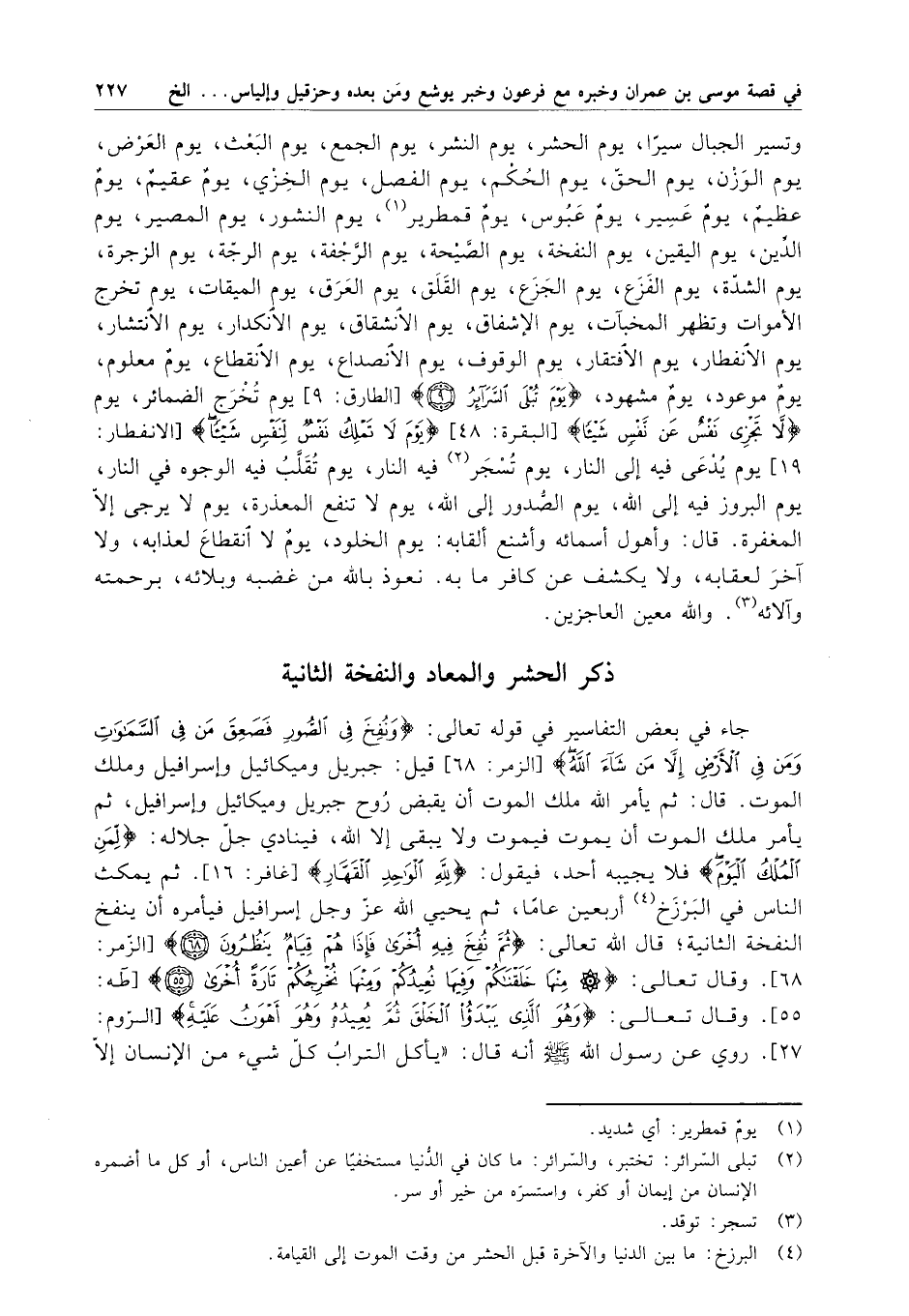 وتسير الجبال سيراً ، يوم الحشر ، يوم النشر ، يوم الجمع ، يوم البعث ، يوم العرض ، يوم الوزن ، يوم الحق ، يوم الحكم ، يوم الفصل ، يوم الخزي ، يوم عقيم ، يوم عظيم ، يوم عسير ، يوم عبوس ، يوم قمطرير ، يوم النشور ، يوم المصير ، يوم الدين ، يوم اليقين ، يوم النفخة ، يوم الصيحة ، يوم الرجفة ، يوم الرجة ، يوم الزجرة ، يوم الشدة ، يوم الفزع ، يوم الجزع ، يوم القلق ، يوم العرق ، يوم الميقات ، يوم تخرج الأموات وتظهر المخبآت ، يوم الإشفاق ، يوم الانشقاق ، يوم الإنكدار ، يوم الانتشار ، يوم الانفطار ، يوم الافتقار ، يوم الوقوف ، يوم الانصداع ، يوم الانقطاع ، يوم معلوم ، يوم موعود ، يوم مشهود ، يوم تبلى السرائر ، يوم تخرج الضمائر ، يوم لا تجزي نفس عن نفس شيئاً ، يوم لا تملك نفس لنفس شيئاً ، يوم يدعي فيه إلى النار ، يوم تسجر فيه النار ، يوم تقلب فيه الوجوه في النار ، يوم البروز فيه إلى الله ، يوم الصدور إلى الله ، يوم لا تنفع المعذرة ، يوم لا يرضى إلا المغفرة . قال : وأهول أسمائه وأشنع ألقابه : يوم الخلود ، يوم لا انقطاع لعذابه ، ولا آخر لعقابه ، ولا يكشف عن كافر ما به . نعوذ بالله من غضبه وبلائه ، برحمته وآلائه . والله معين العاجزين .
