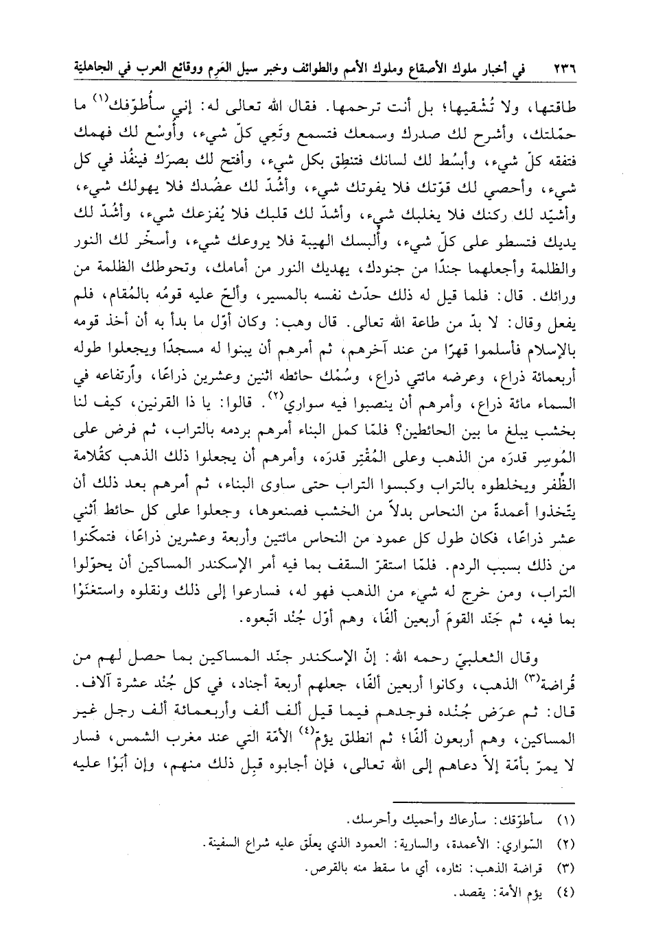 طاقتها ، ولا تشقيها ؛ بل أنت ترحمها . فقال الله تعالى له : إني سأطوقك ما حملتك ، وأشرح لك صدرك وسمعك فتسمع وتعي كل شيء ، وأوسع لك فهمك فتفقه كل شيء ، وأبسط لك لسانك فتنطق بكل شيء ، وأفتح لك بصرك فينفذ في كل شيء ، وأحصي لك قوتك فلا يفوتك شيء ، وأشد لك عضدك فلا يهولك شيء ، وأشيد لك ركنك فلا يغلبك شيء ، وأشد لك قلبك فلا يفزعك شيء ، وأشد لك يديك فتسطو على كل شيء ، وألبسك الهيبة فلا يروعك شيء ، وأسخر لك النور والظلمة وأجعلهما جنداً من جنودك ، يهديك النور من أمامك ، وتحوطك الظلمة من ورائك . قال : فلما قيل له ذلك حدث نفسه بالمسير ، وألح عليه قومه بالمقام ، فلم يفعل وقال : لا بد من طاعة الله تعالى . قال وهب : وكان أول ما بدأ به أن أخذ قومه بالإسلام فأسلموا قهراً من عند آخرهم ، ثم أمرهم أن يبنوا له مسجداً ويجعلوا طوله أربعمائة ذراع ، وعرضه مائتي ذراع ، وسمك حائطه اثنين وعشرين ذراعاً ، وارتفاعه في السماء مائة ذراع ، وأمرهم أن ينصبوا فيه سواري . قالوا : يا ذا القرنين ، كيف لنا بخشب يبلغ ما بين الحائطين ؟ فلما كمل البناء أمرهم بردمه بالتراب ، ثم فرض على الموسر قدره من الذهب وعلى المقتر قدره ، وأمرهم أن يجعلوا ذلك الذهب كقلامة الظفر ويخلطوه بالتراب وكبسوا التراب حتى ساوى البناء ، ثم أمرهم بعد ذلك أن يتخذوا أعمدة من النحاس بدلاً من الخشب فصنعوها ، وجعلوا على كل حائط اثني عشر ذراعاً ، فكان طول كل عمود من النحاس مائتين وأربعة وعشرين ذراعاً . فتمكنوا من ذلك بسبب الردم . فلما استقر السقف بما فيه أمر الإسكندر المساكين أن يحولوا التراب ، ومن خرج له شيء من الذهب فهو له ، فسارعوا إلى ذلك ونقوله واستغنوا بما فيه ، ثم جند القوم أربعين ألفاً ، وهم أول جند اتبعوه . هب فهو له ، فسارعوا إلى ذلك ونقوله واستغنوا بما فيه ، ثم جند القوم أربعين ألفاً ، وهم أول جند اتبعوه .