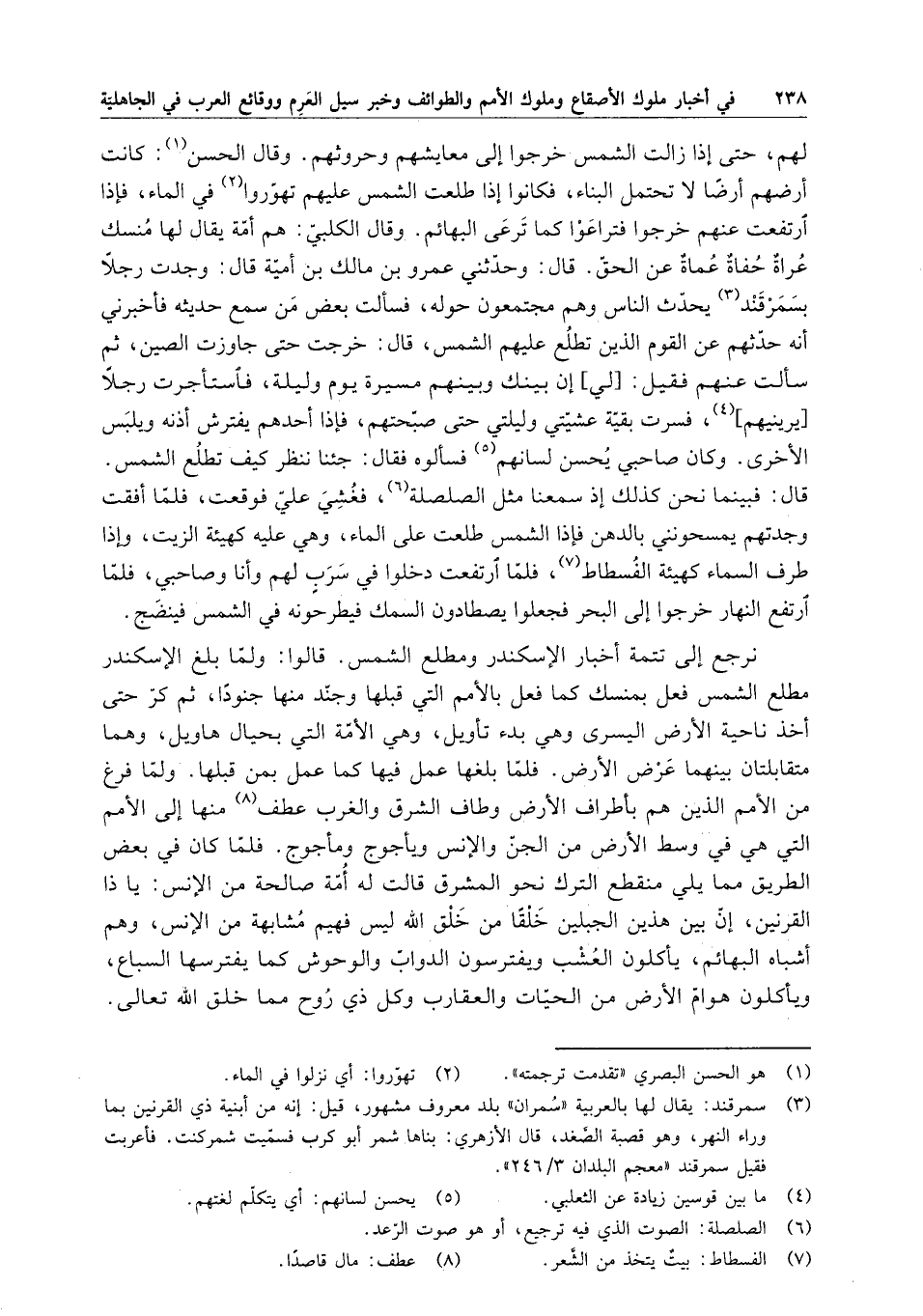 لهم ، حتى إذا زالت الشمس خرجوا إلى معايشهم وحروثهم . وقال الحسن : كانت أرضهم أرضاً لا تحتمل البناء ، فكانوا إذا طلعت الشمس عليهم تهوروا في الماء ، فإذا ارتفعت عنهم خرجوا فتراعوا كما ترعى البهائم . وقال الكلبي : هم أمة يقال لها منسك عراة حفاة عماة عن الحق . قال : وحدثني عمرو بن مالك بن أمية قال : وجدت رجلاً بسمرقند يحدث الناس وهم مجتمعون حوله ، فسألت بعض من سمع حديثه فأخبرني أنه حدثهم عن القوم الذين تطلع عليهم الشمس ، قال : خرجت حتى جاوزت الصين ، ثم سألت عنهم فقيل : لي إن بينك وبينهم مسيرة يوم وليلة ، فاستأجرت رجلاً يرينيهم ، فسرت بقية عشيتي وليلتي حتى صبحتهم ، فإذا أحدهما يفترش أذنه ويلبس الأخرى . وكان صاحبي يحسن لسانهم فسألوه فقال : جئنا ننظر كيف تطلع الشمس . قال : فبينما نحن كذلك إذ سمعنا مثل الصلصلة ، فغشي علي فوقعت ، فلما أفقت وجدتهم يمسحونني بالدهن فإذا الشمس طلعت على الماء ، وهي عليه كهيئة الزيت ، وإذا طرف السماء كهيئة الفسطاط ، فلما ارتفعت دخلوا في سرب لهم وأنا وصاحبي ، فلما ارتفع النهار خرجوا إلى البحر فجعلوا يصطادون السمك فيطرحونه في الشمس فينضج . نرجع إلى تتمة أخبار الإسكندر ومطلع الشمس . قالوا : ولما بلغ الإسكندر مطلع الشمس فعل بمنسك كما فعل بالأمم التي قبلها وجند منها جنوداً ، ثم كر حتى أخذ ناحية الأرض اليسرى وهي بدء تاويل ، وهي الأمة التي بحيال هاويل ، وهما متقابلتان بينهما عرض الأرض . فلما بلغها عمل فيها كما عمل بمن قبلها . ولما فرغ من الأمم الذين هم بأطراف الأرض وطاف الشرق والغرب عطف منها إلى الأمم التي هي في وسط الأرض من الجن والإنس ويأجوج ومأجوج . فلما كان في بعض الطريق مما يلي منقطع الترك نحو المشرق قالت له أمة صالحة من الإنس : يا ذا القرنين ، إن بين هذين الجبلين خلقاً من خلق الله ليس فيهم مشابهة من الإنسان ، وهم أشباه البهائم ، يأكلون العشب ويفترسون الدواب والوحوش كما يفترسها السباع ، ويأكلون هوام الأرض من الحيات والعقارب وكل ذي روح مما خلق الله تعالى .