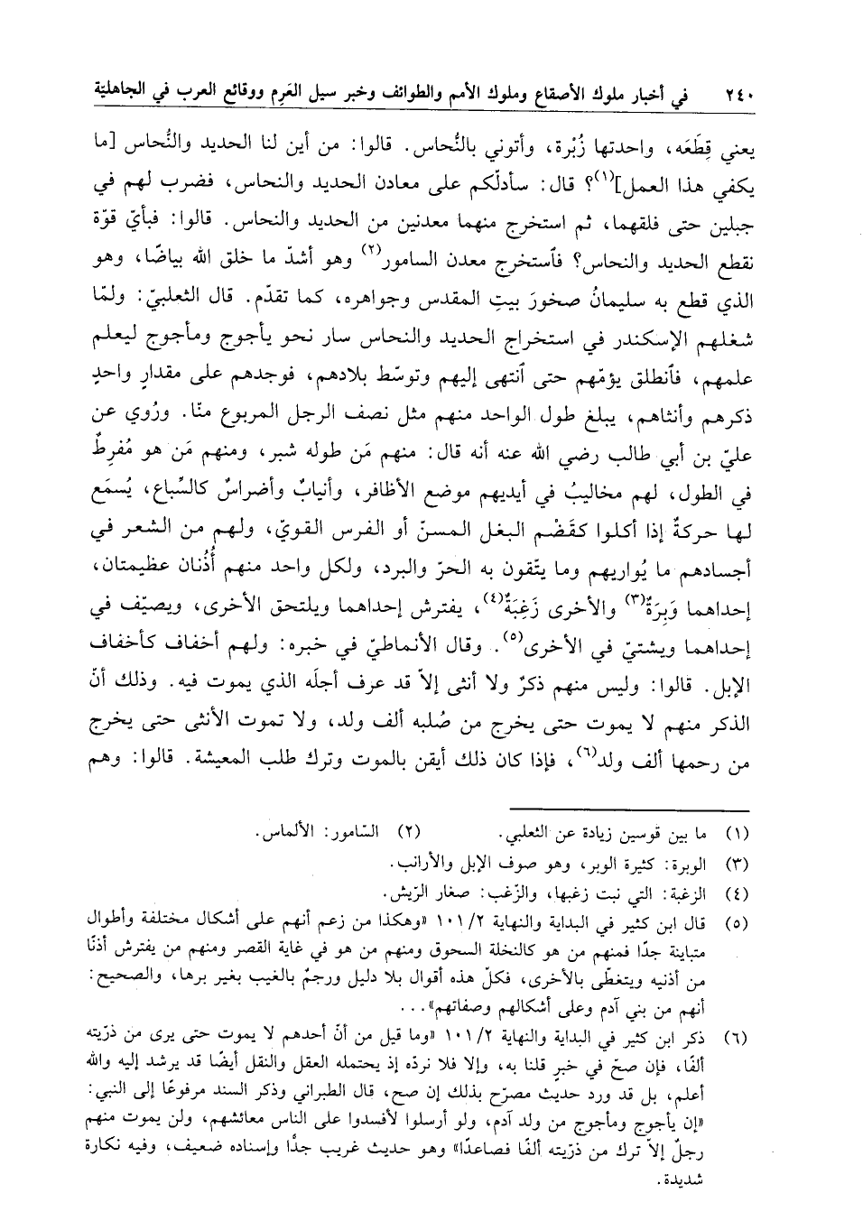 يعني قطعة ، واحدتها زبرة ، وأتوني بالنحاس . قالوا : من أين لنا الحديد والنحاس ما يكفي هذا العمل ؟ قال ، سأدلكم على معادن الحديد والنحاس ، فضرب لهم في جبلين حتى فلقهما ، ثم استخرج منهما معدنين من الحديد والنحاس . قالوا : فبأي قوة نقطع الحديد والنحاس ؟ فاستخرج معدن السامور وهو أشد ما خلق الله بياضاً ، وهو الذي قطع به سليمان صخور بيت المقدس وجواهره ، كما تقدم . قال الثعلبي : ولما شغلهم الإسكندر في استخراج الحديد والنحاس سار نحو يأجوج ومأجوج ليعلم علمهم ، فانطلق يؤمهم حتى انتهى إليهم وتوسط بلادهم ، فوجدهم على مقدار واحد ذكرهم وأنثاهم ، يبلغ طول الواحد منهم مثل نصف الرجل المربوع منا . وروي عن علي بن أبي طالب رضي الله عنه أنه قال : منهم من طوله شبر ، ومنهم من هو مفرط في الطول ، لهم مخاليب في أيديهم موضع الأظافر ، وأنياب وأضراس كالسباع ، يسمع لها حركة إذا أكلوا كقضم البغل المسن أو الفرس القوي ، ولهم من الشعر في أجسادهم ما يواريهم وما يتقون به الحر والبرد ، ولكل واحد منهم أذنان عظيمتان ، إحداهما وبرة والأخرة زغبة ، يفترش إحداهما ويلتحف الأخرى ، ويصيف في إحداهما ويشتي في الأخرى . وقال الأنماطي في خبره : ولهم أخفاف كأخفاف الإبل . قالوا : وليس منهم ذكر ولا أنثى إلا وقد عرف أجله الذي يموت فيه . وذلك أن الذكر منهم لا يموت حتى يخرج من صلبه ألف ولد ، ولا تموت الأنثى حتى يخرج من رحمها ألف ولد ، فإذا كان ذلك أيقن بالموت وترك طلب المعيشة . قالوا : وهم