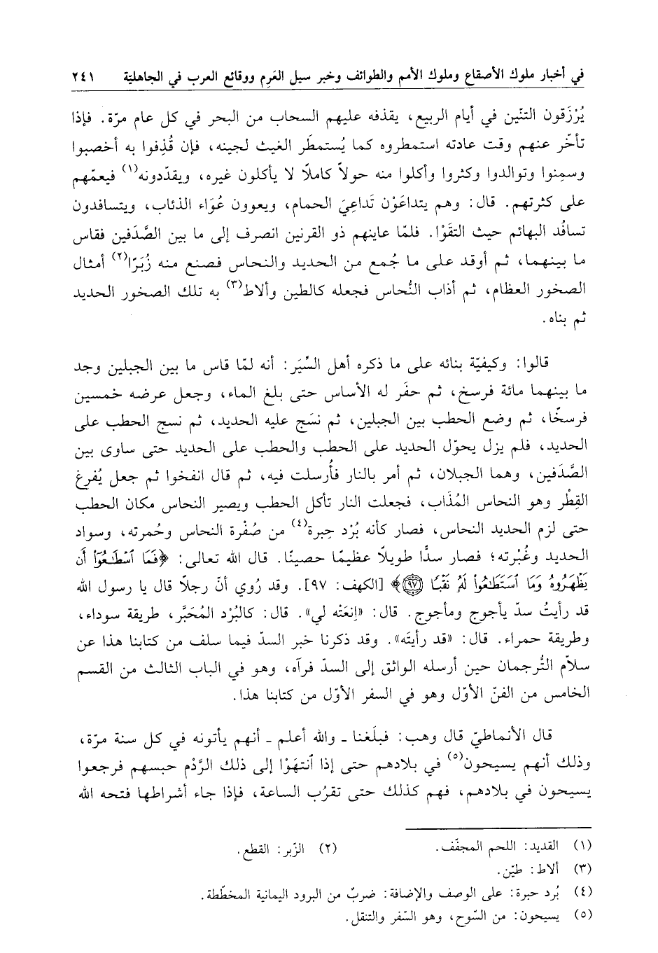 يرزقون التنين في أيام الربيع ، ويقذفه عليهم السحاب من البحر في كل عام مرة . فإذا تأخر عنهم وقت عادته استمطروه كما يستمطر الغيث لجينه ، فإن قذفوا به أخصبوا وسمنوا وتوالدوا وكثروا وأكلوا منه حولاً كاملاً لا يأكلون غيره ، ويقددونه فيعمهم على كثرتهم . قال : وهم يتداعون تداعي الحمام ، ويعوون عواء الذئاب ، ويتسافدون تسافد البهائم حيث التقوا . فلما عاينهم ذو القرنين انصرف إلى ما بين الصدفين فقاس ما بينهما ، ثم أوقد على ما جمع من الحديد والنحاس فصنع منه زبراً أمثال الصخور العظام ، ثم أذاب النحاس فجعله كالطين وألاط به تلك الصخور الحديد ثم بناه . قالوا : وكيفية بنائه على ما ذكره أهل السير : أنه لما قاس ما بين الجبلين وجد ما بينهما مائة فرسخ ، ثم حفر له الأساس حتى بلغ الماء ، وجعل عرضه خمسين فرسخاً ، ثم وضع الحطب بين الجبلين ، ثم نسج عليه الحديد ، ثم نسج الحطب على الحديد ، فلم يزل يحول الحديد على الحطب والحطب على الحديد حتى ساوى بين الصدفين ، وهما الجبلان ، ثم أمر بالنار فأرسلت فيه ، ثم قال انفخوا ثم جعل يفرغ القطر وهو النحاس المذاب فجعلت النار تأكل الحطب ويصير النحاس مكان الحطب حتى لزم الحديد النحاس فصار كأنه برد حبرة من صفرة النحاس وحمرته ، وسواد الحديد وغبرته ؛ فصار سداً طويلاً عظيماً حصيناً . قال الله تعالى : " فما اسطاعوا أن يظهروه وما استطاعوا له نقباً " . وقد روي أن رجلاً قال يا رسول الله قد رأيت سد يأجوج ومأجوج . قال : " انعته لي " . قال : كالبرد المحبر ، طريقه سوداء ، وطريقه حمراء . قال : " قد رأيته " . وقد ذكرنا خبر السد فيما سلف من كتابنا هذا عن سلام الترجمان حين أرسله الواثق إلى السد فرآه ، وهو في الباب الثالث من القسم الخامس من الفن الأول وهو في السفر الأول من كتابنا هذا .
