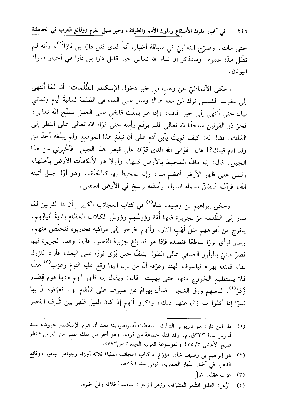 وحكى إبراهيم بن وصيف شاه في كتاب العجائب الكبير : أن ذا القرنين لما سار إلى الظلمة مر بجزيرة فيها أمة رءوسهم رءوس الكلاب العظام بادية أنيابهم ، يخرج من أفواههم مثل لهب النار ، وأنهم خرجوا إلى مراكبه فحاربوه فتخلص منهم ، وسار فرأى نوراً ساطعاً فقصده فإذا هو قد بلغ جزيرة القصر . قال : وهذه الجزيرة فيها قصر مبني بالبلور الصافي عالي الطول يشف حتى يرى نوره على البعد ، فأراد النزول بها ، فمنعه بهرام فيلسوف الهند وعرفه أن من نزل إليها وقع عليه النوم وعزب عقله فلا يستطيع الخروج منها حتى يهلك . قال : ويقال إنه ظهر لهم منها قوم قصار زعر ، لباسهم ورق الشجر . فسأل بهرام عن صبرهم على المقام بها ، فعرفوه أن بها ثمر إذا أكلوا منه زال عنهم ذلك ، وذكروا أنهم إذا كان الليل ظهر بين شرف القصر مثل المصابيح