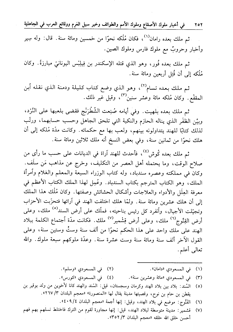 ثم ملك بعده فور ، وهو الذي قتله الإسكندر بن فيلبس اليوناني مبارزة . وكان ملكه إلى أن قتل أربعين ومائة سنة . ثم ملك بعد تسام ، وهو الذي وضع كتاب كليلة ودمنة الذي نقله ابن المقفع . وكان ملكه مائة وعشر سنين ، وقيل غير ذلك . ثم ملك بعده بلهيت . وفي أيامه صنعت الشطرنج فقضى بلعبها على النرد ، وبين الظفر الذي يناله الحازم والنكبة التي تلحق الجاهل وحسب حسابهما ، ورتب لذلك كتاباً للهند يتداولونه بينهم ، ولعب بها مع حكمائه . وكانت مدة ملكه إلى أن هلك نحواً من ثمانين سنة ، وفي بعض النسخ أنه ملك ثلاثين ومائة سنة .