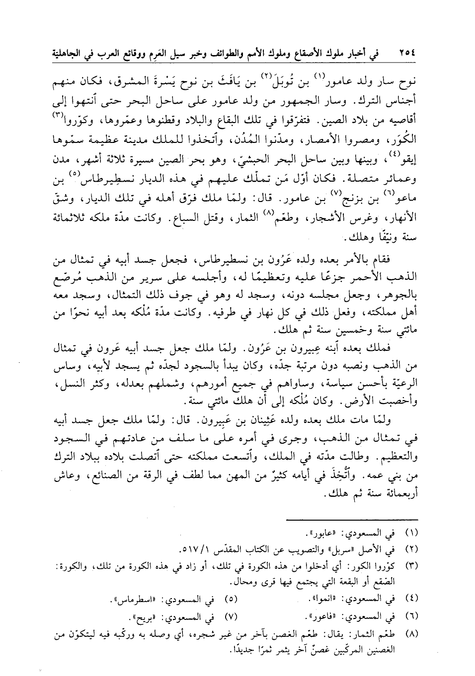 فملك بعده ابنه عبيرون بن عرون . ولما ملك جعل جسد أبيه عرون في تمثال من الذهب ونصبه دون مرتبة جده ، وكان يبدأ بالسجود لجده ثم يسجد لأبيه ، وساس الرعية بأحسن سياسة ، وساواهم في جميع أمورهم ، وشملهم بعدله ، وكثر النسل ، وأخصبت الأرض . وكان ملكه إلى أن هلك مائتي سنة . ولما مات ملك بعده ولده عثينان بن عبيرون . قال : ولما ملك جعل جسد أبيه في تمثال من الذهب ، وجرى في أمره على ما سلف من عادتهم في السجود والتعظيم . وطالت مدته في الملك ، واتسعت مملكته حتى اتصلت بلاده ببلاد الترك من بني عمه . واتخذ في أيامه كثير من المهن مما لطف في الرقة من الصنائع ، وعاش أربعمائة سنة ثم هلك .