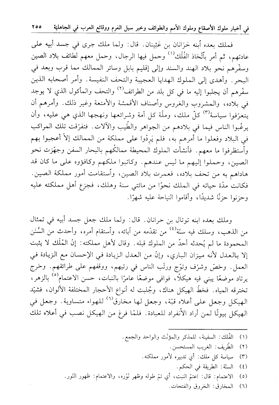 فملك بعده ابنه حرانان بن عثينان . قال : ولما ملك جرى في جسد أبيه على عادتهم ، ثم أمر باتخاذ الفلك وحمل فيها الرجال ، وحمل معهم لطائف بلاد الصين وسفرهم نحو بلاد الهند والسند وإلى إقليم بابل وسائر الممالك مما قرب وبعد في البحر . وأهدى إلى الملوك الهدايا العجيبة والتحف النفيسة . وأمر أصحابه الذين سفرهم أن يجلبوا إليه ما في كل بلد من الطرائف والتحف والمأكول الذي لا يوجد في بلاده ، والمشروب والعروس وأصناف الأقمشة والأمتعة وغير ذلك . وأمرهم أن يتعرفوا سياسة كل ملك ، وملة كل أمة وشرائعها ونهجها الذي هي عليه ، وأن يرغبوا الناس فيما في بلادهم من الجواهر والطيب والآلات . فتفرقت تلك المراكب في البلاد وفعلوا ما أمرهم به ، فلم يردوا على مملكة من الممالك إلا أعجبوا بهم واستظرفوا ما معهم . فأنشأت الملوك المحيطة ممالكهم بالبحار السفن وجهزت نحو الصين ، وحملوا إليهم ما ليس عندهم . وكاتبوا ملكهم وكافئوه على ما كان قد هاداهم به من تحف بلاده ، فعمرت بلاد الصين ، واستقامت أمور مملكة الصين . فكانت مدة حياته في الملك نحواً من مائتي سنة وهلك ، فجزع أهل مملكته عليه وحزنوا حزناً شديداً ، وأقاموا النياحة عليه شهراً . وملك بعده ابنه توتال بن حرانان . قال : ولما ملك جعل جسد أبيه في تمثال من الذهب ، وسلك فيه سنة من تقدمه من آبائه ، واستقام أمره ، وأحدث من السنن المحمودة ما لم يحدثه أحد من الملوك قبله . وقال لأهل مملكته : إن الملك لا يثبت إلا بالعدل لأنه ميزان الباري ، وإن من العدل الزيادة في الإحسان مع الزيادة في العمل . وخص وشرف وتوج ورتب الناس في رتبهم ، ووقفهم على طرائفهم . وخرج يرتاد موضعاً يبنى فيه هيكلاً ، فوافى موضعاً عامراً بالنبات ، حسن الاعتمام بالزهر ، تخترقه المياه . فحط الهيكل هناك ، وجلبت له أنواع الأحجار المختلفة الألوان ، فشيد الهيكل وجعل على أعلاه قبة ، وجعل لها مخارق للهواء متساوية . وجعل في الهيكل بيوتاً لمن أراد الانفراد للعبادة . فلما فرغ من الهيكل نصب في أعلاه