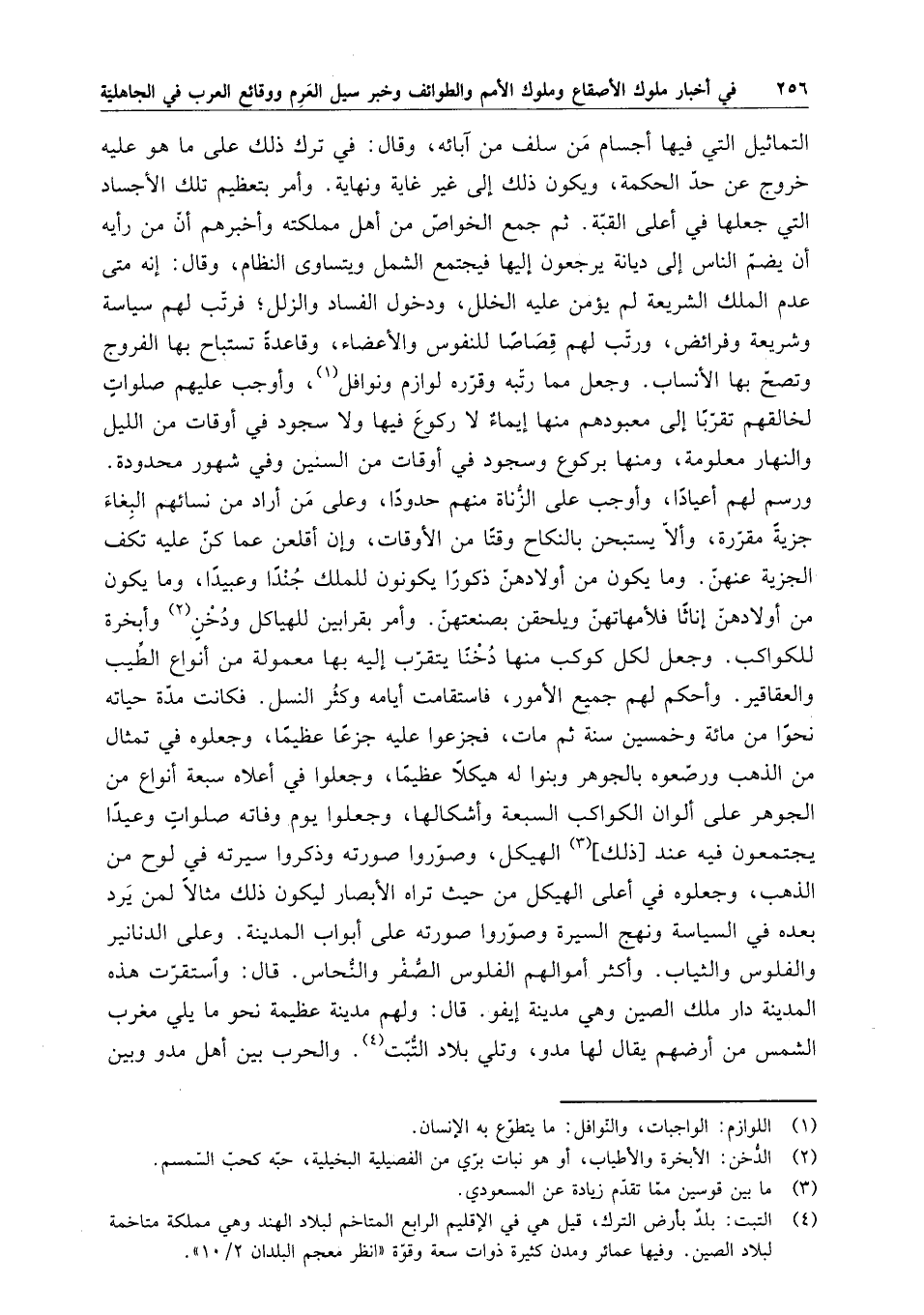 تلك التماثيل التي فيها أجسام من سلف من آبائه ، وقال : في ترك ذلك على ما هو عليه خروج عن حد الحكمة ، ويكون ذلك إلى غير غاية ونهاية . وأمر بتعظيم تلك الأجساد التي جعلها في أعلى القبة . ثم جمع الخواص من أهل مملكته وأخبرهم أن من رأيه أن يضم الناس إلى ديانة يرجعون إليها فيجتمع الشمل ويتساوى النظام ، وقال : إنه متى عدم الملك الشريعة لم يؤمن عليه الخلل ، ودخول الفساد والزلل ؛ فرتب لهم سياسة وشريعة وفرائض ، ورتب لهم قصاصاً للنفوس والأعضاء ، وقاعدة تستباح بها الفروج وتصح بها الأنساب . وجعل مما رتبه وقرره لوازم ونوافل ، وأوجب عليهم صلوات لخالقهم تقرباً إلى معبودهم منها إيماء لا ركوع فيها ولا سجود في أوقات من الليل والنهار معلومة ، ومنها بركوع وسجود في أوقات من السنين وفي شهور محدودة . ورسم لها أعياداً ، وأوجب على الزناة منهم حدوداً ، وعلى من أراد من نسائهم البغاء جزية مقررة ، وألا يستبحن بالنكاح وقتاً من الأوقات ، وإن أقلعن عما كن عليه تكف الجزية عنهن . وما يكون من أولادهن ذكوراً يكونون للملك جنداً وعبيداً ، وما يكون من أولادهن إناثاً فلأمهاتهن ويلحقن بصنعتهن . وأمر بقرابين للهياكل ودخن وأبخرة للكواكب . وجعل لكل كوكب منها دخناً يتقرب إليه بها معمولة من أنواع الطيب والعقاقير . وأحكم لهم جميع الأمور ، فاستقامت أيامه وكثر النسل . فكانت مدة حياته نحواً من مائة وخمسين سنة ثم مات ، فجزعوا عليه جزعاً عظيماً ، وجعلوه في تمثال من الذهب ورصعوه بالجوهر وبنوا له هيكلاً عظيماً ، وجعلوا في أعلاه سبعة أنواع من الجوهر على ألوان الكواكب السبعة وأشكالها ، وجعلوا يوم وفاته صلوات وعيداً يجتمعون فيه عند ذلك الهيكل ، وصوروا صورته وذكروا سيرته في لوح من الذهب ، وجعلوه في أعلى الهيكل من حيث تراه الأبصار ليكون ذلك مثالاً لمن يرد بعده في السياسة ونهج السيرة وصوروا صورته على أبواب المدينة . وعلى الدنانير والفلوس والثياب . وأكثر أموالهم الفلوس الصفر والنحاس . قال : واستقرت هذه المدينة دار ملك الصين وهي مدينة إيقو . قال : ولهم مدينة عظيمة نحو ما يلي مغرب الشمس من أرضهم يقال لها مدو ، وتلي بلاد التبت . والحرب بين أهل مدو وبين