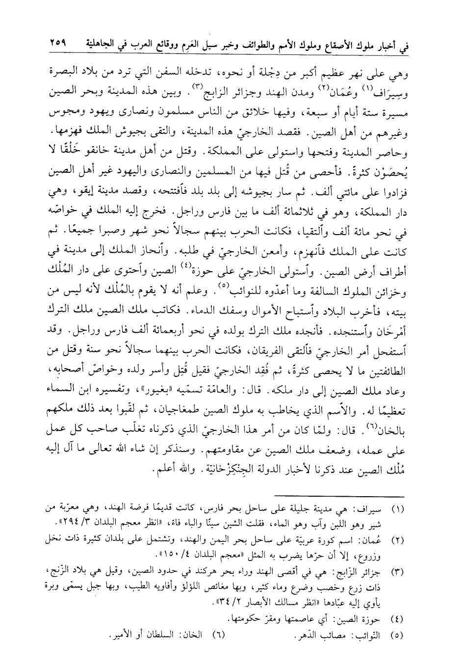 وهي على نهر عظيم أكبر من دجلة أو نحوه ، تدخله السفن التي ترد من بلاد البصرة وسيراف وعمان ومدن الهند وجزائر الزابج . وبين هذه المدينة وبحر الصين مسيرة ستة أيام أو سبعة ، وفيها خلائق من الناس مسلمون ونصارى ويهود ومجوس وغيرهم من أهل الصين . فقصد الخارجي هذه المدينة ، والتقى بجيوش الملك فهزمها . وحاصر المدينة وفتحها واستولى على المملكة ، وقتل من أهل مدينة خانقو خلقاً لا يحصون كثرة ، فأحصى من قتل فيها من المسلمين والنصارى واليهود غير أهل الصين فزادوا على مائتي ألف . ثم سار بجيوشه إلى بلد بلد فافتتحه . وقصد مدينة إيقو ، وهي دار المملكة ، وهو في ثلاثمائة ألف ما بين فارس وراجل . فخرج إليه الملك في خواصه في نحو مائة ألف والتقيا ، فكانت الحرب بينهم سجالاً نحو شهر وصبرا جميعاً . ثم كانت على الملك فانهزم ، وأمعن الخارجي في طلبه . وانحاز الملك إلى مدينة في أطرف أرض الصين . واستولى الخارجي على حوزة الصين واحتوى على دار الملك وخزائن الملوك السالفة وما أعدوه للنوائب . وعلم أنه لا يقوم بالملك لأنه ليس من بيته ، فأخرب البلاد واستباح الأموال وسفك الدماء . فكاتب ملك الصين ملك الترك أمرخان واستنجده . فأنجده ملك الترك بولده في نحو أربعمائة ألف فارس وراجل . وقد استفحل أمر الخارجي فالتقى الفريقان ، فكانت الحرب بينهما سجالاً نحو سنة وقتل من الطائفتين ما لا يحصى كثرة ، ثم فقد الخارجي فقيل قتل وأسر ولده وخواص أصحابه ، وعاد ملك الصين إلى دار ملكه . قال : والعامة تسميه بغيور ، وتفسيره بن السماء تعظيماً له . والاسم الذي يخاطب به ملوك الصين طمغاجيان ، ثم لقبوا بعد ذلك ملكهم بالخان . قال : ولما كان من أمر هذا الخارجي الذي ذكرناه تغلب صاحب كل عمل على عمله ، وضعف ملك الصين عن مقاومتهم . وسنذكر إن شاء الله تعالى ما آل إليه ملك الصين عند ذكرنا لأخبار الدولة الجنكزخانية . والله أعلم .