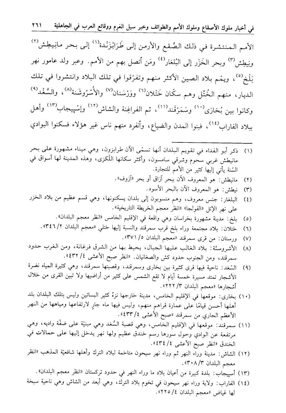 الأمم المنتشرة في ذلك الصقع والأرمن إلى طرابزندة إلى بحر مانيطش ونيطش وبحر الخزر إلى البلغار ومن اتصل بهم من الأمم . وعبر ولد عامور نهر بلخ ، ويمم بلا الصين الأكثر منهم وتفرقوا في تلك البلاد وانتشروا في تلك الديار ، منهم الختل وهم سكان ختلان وورسنان والأسروشنة ، والسغد وكانوا بين بخارى وسمرقند ، ثم الفراغنة والشاش وإسبيجاب وأهل بلاد الفاراب ، فبنوا المدن والضياع ، وانفرد منهم ناس غير هؤلاء فسكنوا البوادي