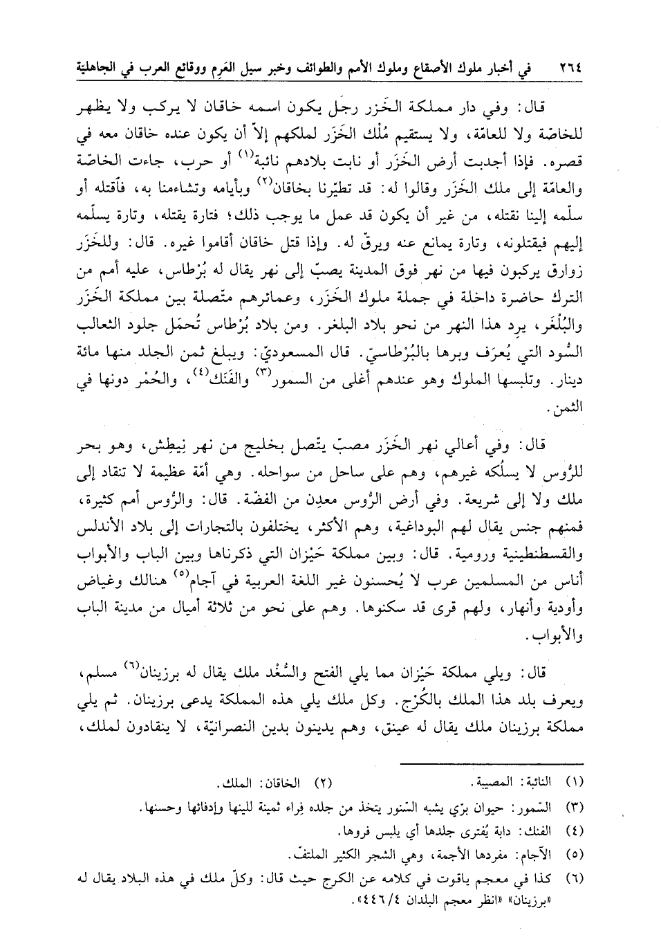 قال : وفي دار مملكة الخزر رجل يكون اسمه خاقان لا يركب ولا يظهر للخاصة ولا للعامة ، ولا يستقيم ملك الخزر لملكهم إلا أن يكون عنده خاقان معه في قصره . فإذا أجدبت أرض الخزر أو نابت بلادهم نائبة أو حرب ، جاءت الخاصة والعامة إلى ملك الخزر وقالوا له : قد تطيرنا بخاقان وبأيامه وتشاءمنا به ، فاقتله أو سلمه إلينا نقتله ، من غير أن يكون قد عمل ما يوجب ذلك ؛ فتارة يقتله ، وتارة يسلمه إليهم فيقتلونه ، وتارة يمانع عنه ويرق له . وإذا قتل خاقان أقاموا غيره . قال : وللخزر زوارق يركبون فيها من نهر فوق المدينة يصب إلى نهر يقال له برطاس ، عليه أمم من الترك حاضرة داخلة في جملة ملوك الخزر ، وعمائرهم متصلة بين مملكة الخزر والبلغر ، يرد هذا النهر من نحو بلاد البلغر . ومن بلاد برطاس تحمل جلود الثعالب السود التي يعرف وبرها بالبرطاسي . قال المسعودي : ويبلغ ثمن الجلد منها مائة دينار . وتلبسها الملوك وهو عندهم أغلى من السمور والفنك ، والحمر دونها في الثمن .