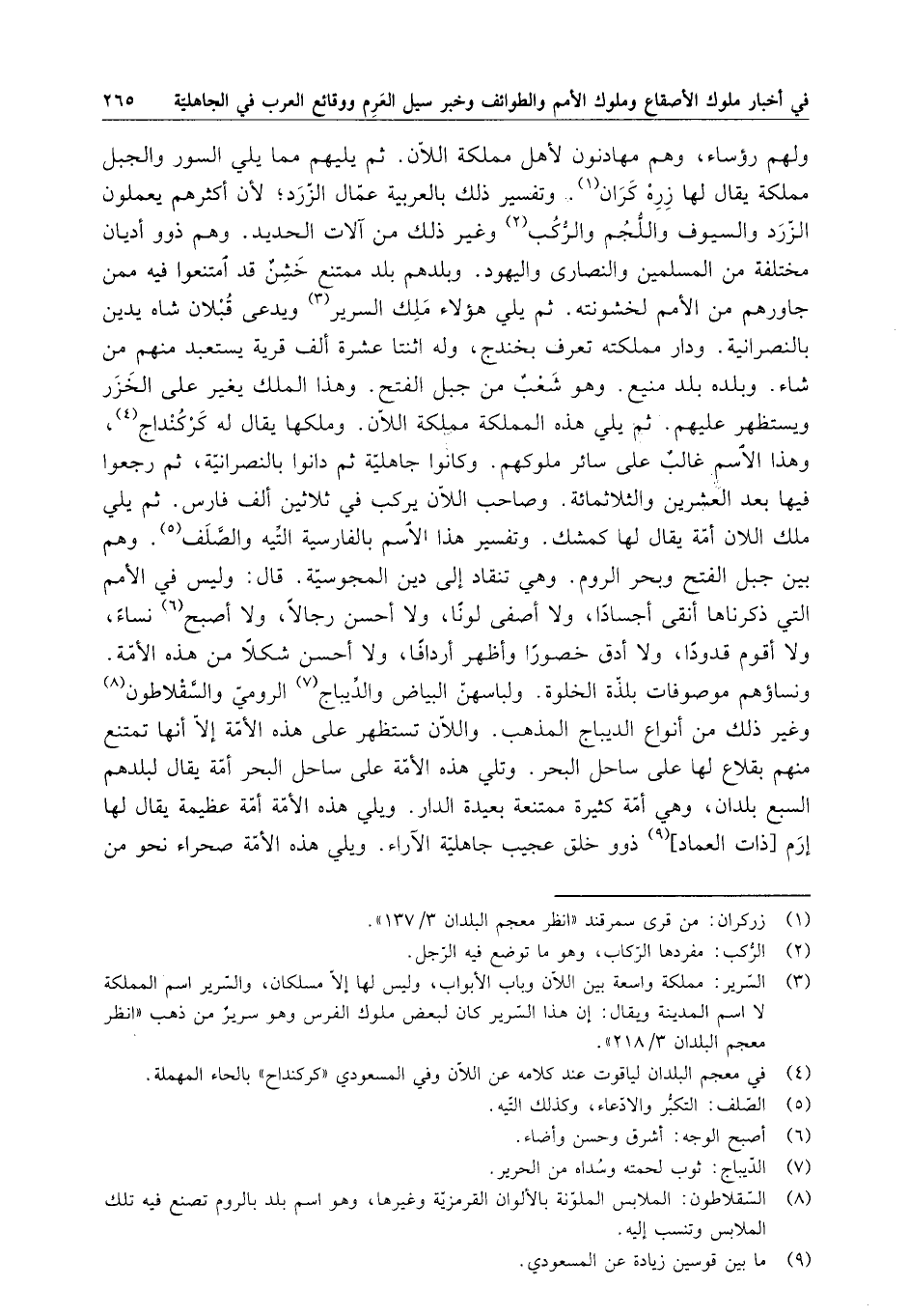 ولهم رؤساء . وهم مهادنون لأهل مملكة اللان . ثم يليهم مما يلي السور والجبل مملكة يقال لها زره كران . وتفسير ذلك بالعربية عمال الزرد ؛ لأن أكثرهم يعملون الزرد والسيوف واللجم والركب وغير ذلك من آلات الحديد . وهم ذوو أديان مختلف من المسلمين والنصارى واليهود . وبلدهم بلد ممتنع خشن قد امتنعوا فيه ممن جاورهم من الأمم لخشونته . ثم يلي هؤلاء ملك السرير ويدعى قبلان شاه يدين بالنصرانية . ودار مملكته تعرف بخندج ، وله اثنتا عشرة ألف قرية يستعبد منهم من شاء . وبلده بلد منيع . وهو شعب من جبل الفتح . وهذا الملك يغير على الخزر ويستظهر عليهم . ثم يلي هذه المملكة مملكة اللان . وملكها يقال له كركنداج ، وهذا الاسم غالب على سائر ملوكهم . وكانوا جاهلية ثم دانوا بالنصرانية ، ثم رجعوا فيها بعد العشرين والثلاثمائة . وصاحب اللان يركب في ثلاثين ألف فارس . ثم يلي ملك اللان أمة يقال لها كمشك . وتفسير هذا الاسم بالفارسية التيه والصلف . وهم بين جبل الفتح وبحر الروم . وهي تنقاد إلى دين المجوسية . قال : وليس في الأمم التي ذكرناها أنقى أجساداً ، ولا أصفى لوناً ، ولا أحسن رجالاً ، ولا أصبح نساءً ، ولا أقوم قدوداً ، ولا أرق أخصاراً وأظهر أردافاً ، ولا أحسن شكلاً من هذه الأمة . ونساؤهم موصوفات بلذة الخلوة . ولباسهن البياض والديباج الرومي والسقلاطون وغير ذلك من أنواع الديباج المذهب . واللان تستظهر على هذه الأمة إلا أنها تمتنع منها بقلاع لها على ساحل البحر . وتلي هذه الأمة على ساحل البحر أمة يقال لبلدهم السبع بلدان ، وهي أمة كثيرة ممتنعة بعيدة الدار . ويلي هذه الأمة أمة عظيمة يقال لها إرم ذات العماد ذوو خلق عجيب جاهلية الآراء . ويلي هذه الأمة صحراء نحو من