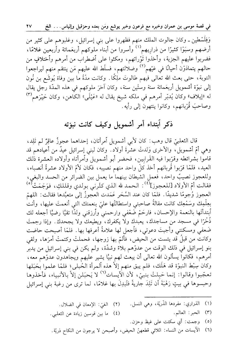 قال الثعلبي قال وهب : كان لأبي أشمويل امرأتان ، إحداهما عجوز عاقر لم تلد ، وهي أم أشمويل ، والأخرى ولدت عشرة أولاد . وكان لبني إسرائيل عيد من أعيادهم قد قاموا بشرائطه وقربوا فيه القرابين ، فحضر أبو أشمويل وامرأتاه وأولاده العشرة ذلك العيد ، فلما قربوا قربانهم أخذ كل واحد منهم نصيبه ، فكان لأم الأولاد عشرة أنصباء ، وللعجوز نصيب واحد ، فعمل الشيطان بينهما ما يعمل بين الضرائر من الحسد والبغي ، فقالت أم الأولاد للعجوز : الحمد لله الذي كثرني بولدي وقللك ، فوجمت العجوز وجوماً شديداً . فلما كان عند السحر عمدت العجوز إلى متعبدها فقالت : اللهم بعلمك وسمعك كانت مقالة صاحبتي واستطالتها علي بنعمتك التي أنعمت عليها وأنت ابتدأتها بالننعمة والإحسان ، فارحم ضعفي وارحمني وارزقني ولداً تقياً رضياً أجعله لك ذخراً في مسجد من مساجدك ، يعبدك ولا يكفرك ، ويطيعك ولا يجحدك . وإذا رحمت ضعفي ومسكنتي وأجبت دعوتي ، فاجعل لها علامة أعرفها بها . فلما أصبحت حاضت وكانت من قبل قد يئست من الحيض ، فألم بها زوجها ، فحملت وكتمت أمرها ، ولقى بنو إسرائيل في ذلك الوقت من عدوهم بلاء وشدة ، ولم يكن في بني إسرائيل من يدبر أمرهم ، فكانوا يسألون الله تعالى أن يبعث لهم نبياً يشير عليهم ويجاهدون عدوهم معه ، وكان سبط النبوة قد هلك ، فلم يبق منهم إلا المرأة الحبلى ؛ فلما علموا بحبلها تعجبوا وقالوا : إنما حبلت بنبي ، لأن الآيسات لا يحبلن إلا بالأنبياء ، فأخذوها وحبسوها في بيت رهبة أن تلد جارية فتبدل بها غلاماً ، لما ترى من رغبة بني إسرائيل