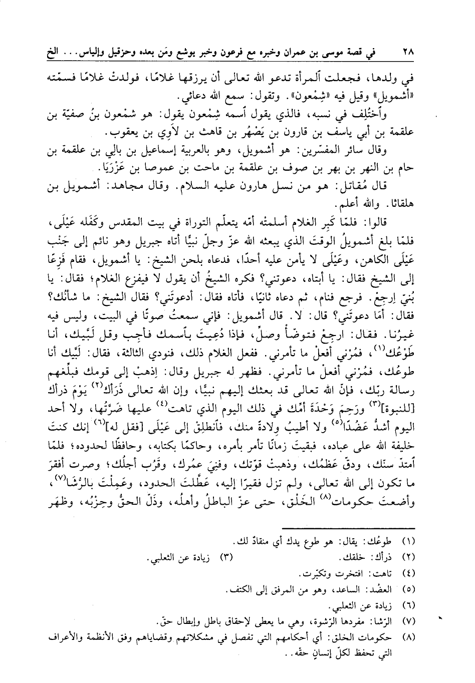 في ولدها ، فجعلت المرأة تدعو الله تعالى أن يرزقها غلاماً ، فولدت غلاماً فسمته أشمويل وقيل فيه شمعون . وتقول : سمع الله دعائي . واختلف في نسبه ، فالذي يقول اسمه شمعون يقول : هو شمعون بن صفية بن علقمة بن أبي ياسف بن قارون بن يصهر بن قاهث بن لاوى بن يعقوب .