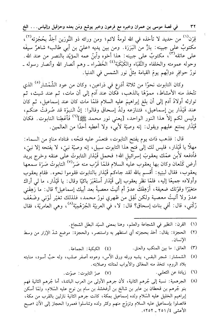 وكان التابوت نحو ثلاثة أذرع في ذراعين ، وكان من عود الشمشار الذي تتخذ منه الأمشاط ، مموهاً بالذهب ، فكان عند آدم إلى أن مات ، ثم عند شيث ، ثم توارثه أولاد آدم إلى أن بلغ إبراهيم - ع - فلما مات كان عند إسماعيل ، ثم كان عند قيذار بن إسماعيل ، فتنازعه ولد إسحاق وقالوا : إن النبوة قد صرفت عنكم ، وليس لكم إلا هذا النور الواحد ، يعني نور محمد ( صلى الله عليه وسلم ) فأعطنا التابوت . فكان قيذار يمتنع عليهم ويقول : إنه وصية لأبي ، ولا أعطيه أحداً من العالمين . قال : فذهب ذات يوم يفتح التابوت ، فتعسر عليه فتحه ، فناداه مناد من السماء : مهلاً يا قيذار ، فليس لك إلى فتح هذا التابوت سبيل ، إنه وصية نبي ، لا يفتحه إلا نبي ، فادفعه لابن عمك يعقوب إسرائيل الله ؛ فحمل قيذار التابوت على عنقه وخرج يريد أرض كنعان وكان بها يعقوب - ع - فلما قرب منه صر التابوت صرة سمعها يعقوب ، فقال لبنيه : أقسم بالله لقد جاءكم قيذار بالتابوت فقوموا نحوه . فقام يعقوب وأولاده جميعاً إليه ، فلما نظر يعقوب إلى قيذار استعبر باكياً وقال : يا قيذار ، مالي أراك متغيراً وقوتك ضعيفة ، أرهقك عدو أم أتيت معصية بعد أبيك إسماعيل ؟ قال : ما رهقني عدو ولا أتيت معصية ولكن نقل من ظهري نور محمد ، فلذلك تغير لوني وضعف كني ، قال : أفي بنات إسحاق ؟ قال : لا ، في العربية الجرهمية ، وهي العامرية ، فقال