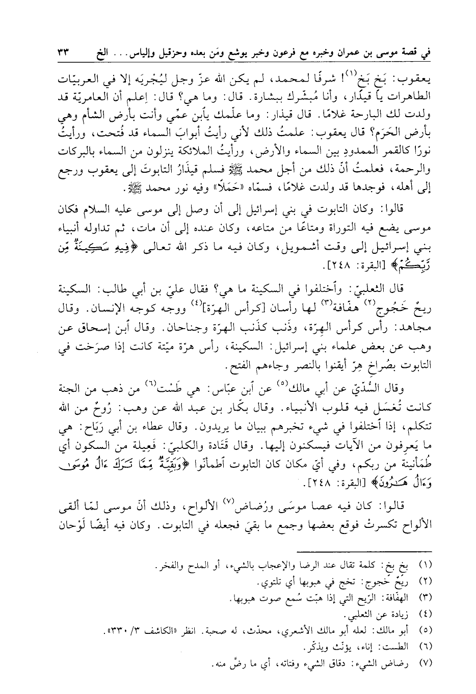يعقوب : بخ بخ شرفاً لمحمد ، لم يكن الله عز وجل ليجريه إلا في العربيات الطاهرات يا قيذار ، وأنا مبشرك ببشارة . قال : وما هي ؟ قال : اعلم أن العامرية قد ولدت لك البارحة غلاماً . قال قيذار : وما علمك يا بن عمي وأنت بأرض الشام وهي بأرض الحرم ؟ قال يعقوب : علمت ذلك لأني رأيت أبواب السماء قد فتحت ، ورأيت نوراً كالقمر الممدود بين السماء والأرض ، ورأيت الملائكة ينزلون من السماء بالبركات والرحمة ، فعملت أن ذلك من أجل محمد ( صلى الله عليه وسلم ) فسلم قيذار التابوت إلى يعقوب ورجع إلى أهله ، فوجدها قد ولدت غلاماً ، فسماه حملا وفيه نور محمد ( صلى الله عليه وسلم ) .