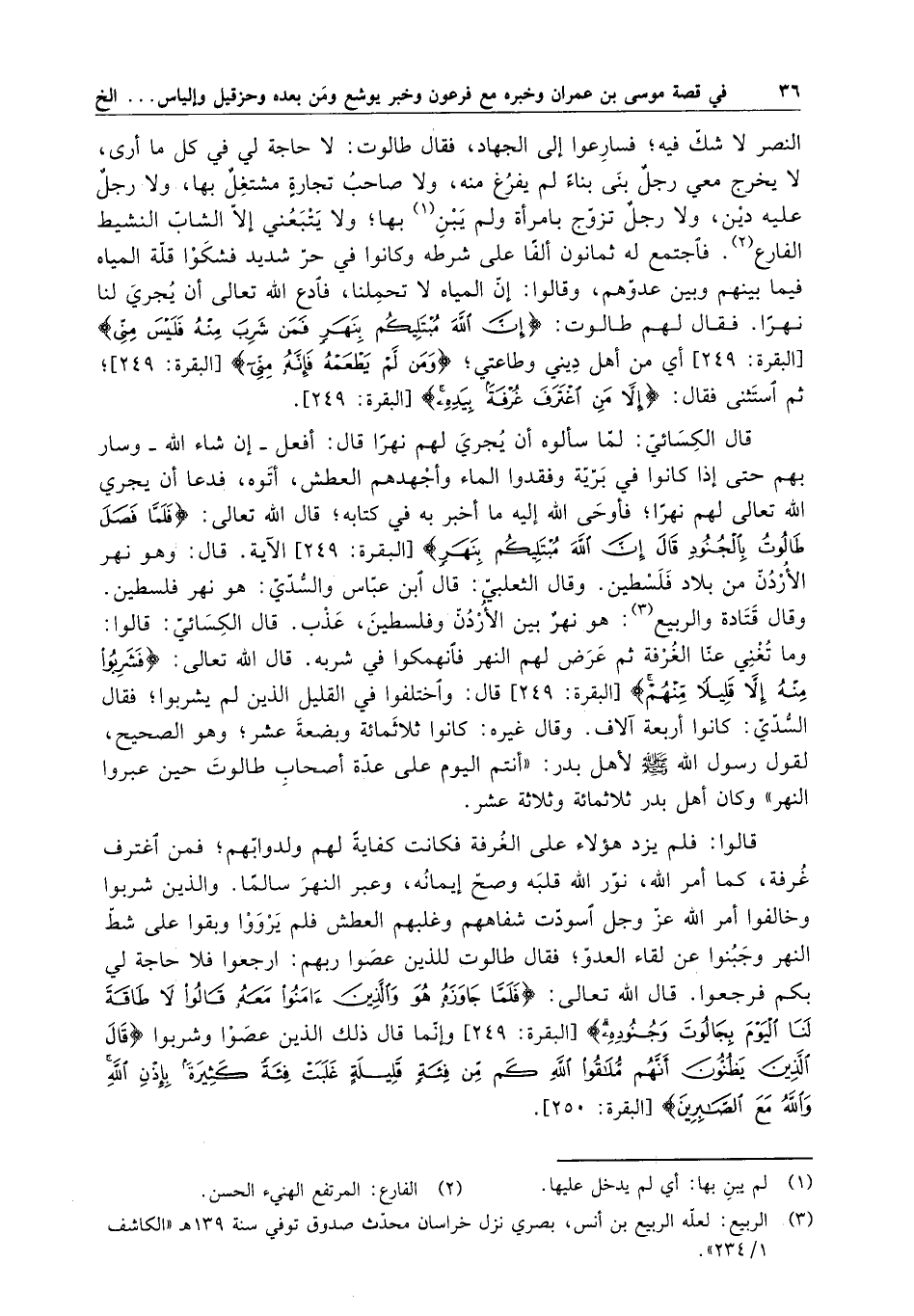 النصر لا شك فيه ؛ فسارعوا إلى الجهاد ، فقال طالوت : لا حاجة لي في كل ما أرى ، لا يخرج معي رجل بنى بناء لم يفرغ منه ، ولا صاحب تجارة مشتغل بها ، ولا رجل عليه دين ، ولا رجل تزوج بامرأة ولم يبن بها ؛ ولا يتبعني إلا الشاب النشيط الفارع . فاجتمع له ثمانون ألفا على شرطه - وكانوا في حر شديد - فشكوا قلة المياه فيما بينهم وبين عدوهم ، وقالوا : إن المياه لا تحملنا ، فادع الله تعالى أن يجرى لنا نهراً . فقال لهم طالوت : " إن الله مبتليكم بنهر فمن شرب منه فليس مني " أي من أهل ديني وطاعتي ؛ " ومن لم يطعمه فإنه مني " ؛ ثم استثنى فقال : " إلا من اغترف غرفة بيده " . قال الكسائي : لما سألوه أن يجري لهم نهراً قال : أفعل - إن شاء الله - وسار بهم حتى إذا كانوا في برية وفقدوا الماء وأجهدهم العطش ، أتوه ، فدعا أن يجري الله تعالى لهم نهراً ؛ فأوحى الله إليه ما أخبر به في كتابه ؛ قال الله تعالى : " فلما فصل طالوت بالجنود قال إن الله مبتليكم بنهر " الآية . قال : وهو نهر الأردن من بلاد فلسطين . وقال الثعلبي : قال ابن عباس والسدي : هو نهر فلسطين . وقال قتادة والربيع : هو نهر بين الأردن وفلسطين ، عذب . قال الكسائي : قالوا : وما تغني عنا الغرفة ثم عرض لهم النهر فانهمكوا في شربه . قال الله تعالى : " فشربوا منه إلا قليلاً منهم " قال : واختلفوا في القليل الذين لم يشربوا ؛ فقال السدي : كانوا أربعة آلاف . وقال غيره : كانوا ثلاثمائة وبضعة عشر ، وهو الصحيح ، لقول رسول الله ( صلى الله عليه وسلم ) لأهل بدر " أنتم اليوم على عدة أصحاب طالوت حين عبروا النهر " وكان أهل بدر ثلاثمائة وثلاثة عشر .