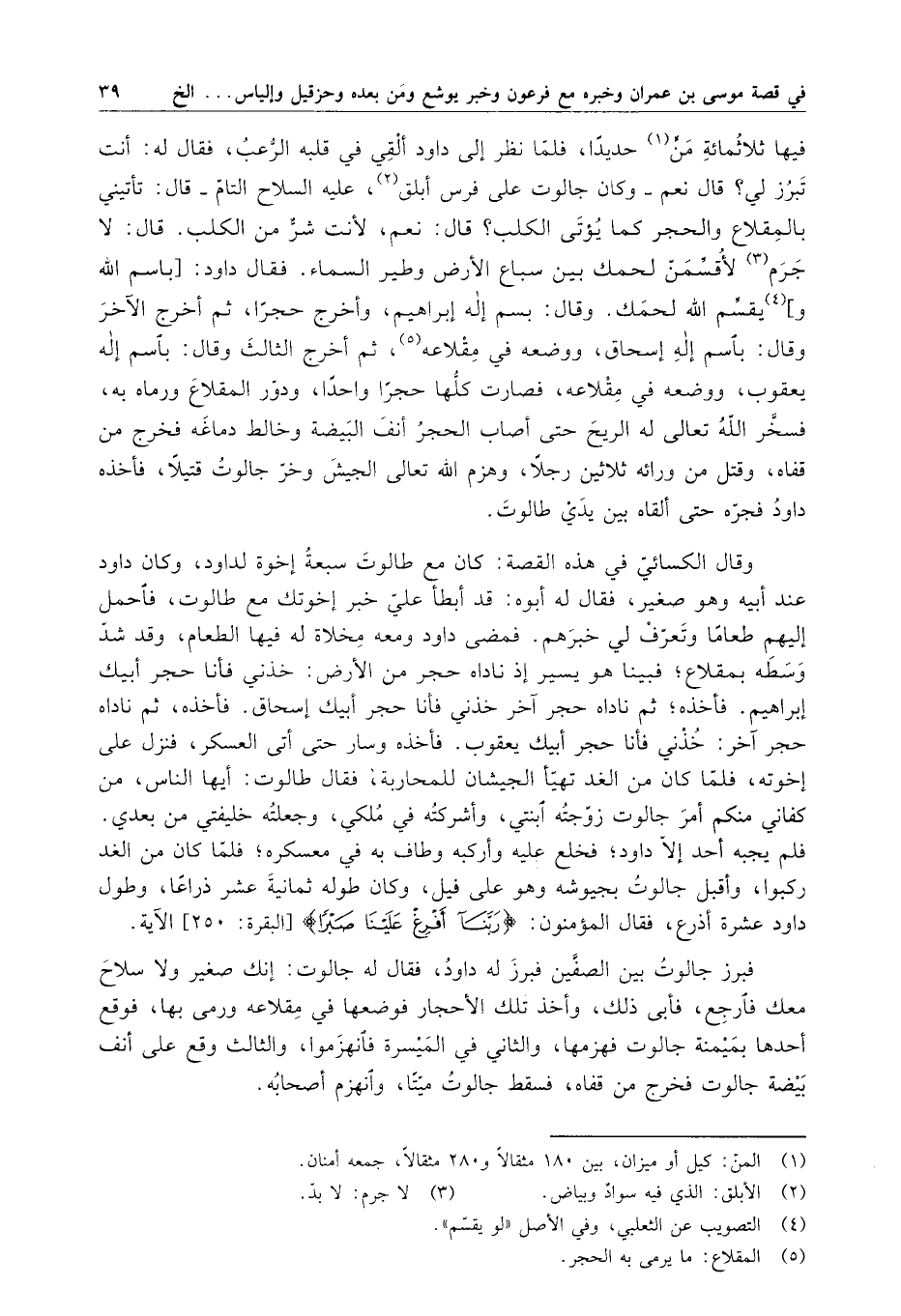 فيها ثلاثمائة من حديدا ، فلما نظر إلى داود ألقى في قلبه الرعب ، فقال له : أنت تبرز لي ؟ قال نعم - وكان جالوت على فرس أبلق ، عليه السلاح التام - قال : تأتيني بالمقلاع والحجر كما يؤتى الكلب ؟ قال : نعم ، لأنت شر من الكلب . قال : لا جرم لأقسمن لحمك بين سباع الأرض وطير السماء . فقال داود : باسم الله ويقسم الله لحمك . وقال : بسم إله إبراهيم ، وأخرج حجراً ، ثم أخرج الآخر وقال : باسم إله إسحاق ، ووضعه في مقلاعه ، ثم أخرج الثالث وقال : باسم إله يعقوب ، ، ووضعه في مقلاعه ، فصارت كلها حجراً واحداً ، ودور المقلاع ورماه به ، فسخر الله تعالى له الريح حتى أصاب الحجر أنف البيضة وخالط دماغه فخرج من قفاه ، وقتل من ورائه ثلاثين رجلاً ، وهزم الله تعالى الجيش وخر جالوت قتيلاً ، فأخذه داود فجره حتى ألقاه بين يدي طالوت . وقال الكسائي في هذه القصة : كان مع طالوت سبعة إخوة لداود ، وكان داود عند أبيه وهو صغير ، فقال له أبوه : قد أبطأ على خبر إخوتك مع طالوت ، فاحمل إليهم طعاماً وتعرف لي خبرهم . فمضى داود ومعه مخلاة له فيها الطعام ، وقد شد وسطه بمقلاع ؛ فبينا هو يسير إذ ناداه حجر من الأرض : خذني فأنا حجر أبيك إبراهيم . فأخذه ؛ ثم ناداه حجر آخر خذني فأنا حجر أبيك إسحاق . فأخذه ، ثم ناداه حجر آخر : خذني فأنا حجر أبيك يعقوب . فأخذه وسار حتى أتى العسكر ، فنزل على إخوته ، فلما كان من الغد تهيأ الجيشان للمحاربة ، فقال طالوت : أيها الناس ، من كفاني منكم أمر جالوت زوجته ابنتي ، وأشركته في ملكي ، وجعلته خليفتي من بعدي . فلم يجبه أحد إلا داود ؛ فخلع عليه وأركبه وطاف به في معسكره ؛ فلما كان من الغد ركبوا ، وأقبل جالوت بجيوشه وهو على فيل ، وكان طوله ثمانية عشر ذراعاً ، وطول داود عشرة أذرع ، فقال المؤمنون : " ربنا أفرغ علينا صبراً " الآية .