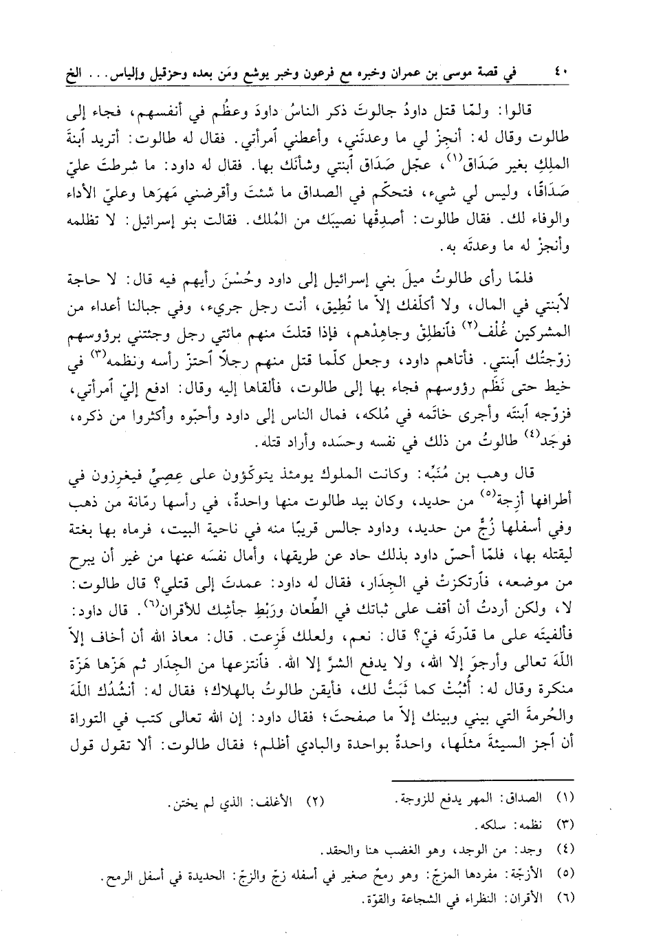 قالوا : ولما قتل داود جالوت ذكر الناس داود وعظم في أنفسهم ، فجاء إلى طالوت وقال له : أنجز لي ما وعدتني ، وأعطني امرأتي . فقال له طالوت : أتريد ابنة الملك بغير صداق ، عجل صداق ابنتي وشأنك بها . فقال له داود : ما شرطت علي صداقاً ، وليس لي شيء ، فتحكم في الصداق ما شئت وأقرضني مهرها وعلي الأداء والوفاء لك . فقال طالوت : أصدقها نصيبك من الملك . فقالت بنو إسرائيل : لا تظلمه وأنجز له ما وعدته به .