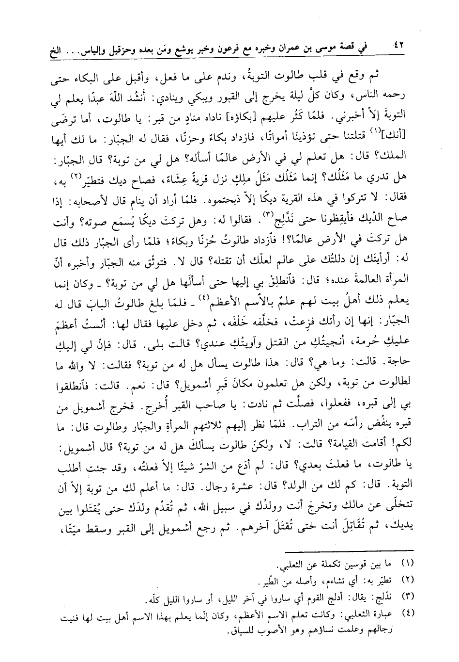 ثم وقع في قلب طالوت التوبة ، وندم على ما فعل ، وأقبل على البكاء حتى رحمه الناس ، وكان كل ليلة يخرج إلى القبور ويبكي وينادي : أنشد الله عبداً يعلم لي التوبة إلا أخبرني . فلما كثر عليهم بكاؤه ناداه مناد من قبر : يا طالوت ، أما ترضى أنك قتلتنا حتى تؤذينا أمواتاً ، فازداد بكاء وحزناً ، فقال له الجبار : مالك أيها الملك ؟ قال : هل تعلم لي في الأرض عالماً أسأله ؟ هل لي من توبة ؟ قال الجبار : هل تدري ما مثلك ؟ إنما مثلك مثل ملك نزل قرية عشاء ، فصاح ديك فتطير به ، فقال : لا تتركوا في هذه القرية ديكاً إلا ذبحتموه . فلما أراد أن ينام قال لأصحابه : إذا صاح الديك فأيقظونا حتى ندلج . فقالوا له : وهل تركت ديكاً يسمع صوته ؟ وأنت هل تركت في الأرض عالماً ؟ فازداد طالوت حزناً وبكاء ؛ فلما رأى الجبار ذلك قال له : أرأيتك إن دللتك على عالم لعلك أن تقتله ؟ قال لا . فتوثق منه الجبار وأخبره أن المرأة العالمة عنده ؛ قال : فانطلق بي إليها حتى أسألها هل لي من توبة ؟ - وكان إنما يعلم ذلك أهل بيت لهم علم بالاسم الأعظم - فلما بلغ طالوت الباب قال له الجبار : إنها إن رأتك فزعت ، فخلفه خلفه ، ثم دخل عليها فقال لها : ألست أعظم عليك حرمة ، أنجيتك من القتلى وآويتك عندي ؟ قالت بلى . قال : فإن لي إليك حاجة . قالت : وما هي ؟ قال : هذا طالوت يسأل هل له من توبة ؟ فقالت : لا والله ما لطالوت من توبة ، ولكن هل تعلمون مكان قبر أشمويل ؟ قال نعم . قالت : فانطلقوا بي إلى قبره ، ففعلوا ، فصلت ثم نادت : يا صاحب القبر أخرج . فخرج أشمويل من قبره ينفض رأسه من التراب . فلما نظر إليهم ثلاثتهم . المرأة والجبار وطالوت قال : ما لكم أقامت القيامة ؟ قالت : لا ، ولكن طالوت يسألك هل له من توبة ؟ قال أشمويل : يا طالوت ، ما فعلت بعدي ؟ قال : لم أدع من الشر شيئاً إلا فعلته ، وقد جئت أطلب التوبة . قال : كم لك من الولد ؟ قال : عشرة رجال . قال : ما أعلم لك من توبة إلا أن تتخلى عن مالك وتخرج أنت وولدك في سبيل الله ، ثم تقدم ولدك حتى يقتلوا بين يديك ، ثم تقاتل أنت حتى تقتل آخرهم . ثم رجع أشمويل إلى القبر وسقط ميتاً ،