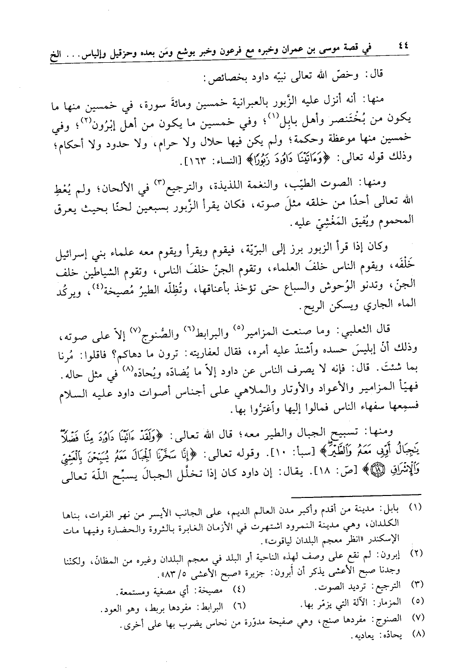 قال : وخص الله تعالى نبيه داود بخصائص : منها : أنه أنزل عليه الزبور بالعبرانية خمسين ومائة سورة ، في خمسين منها ما يكون من بختنصر وأهل بابل ؛ وفي خمسين ما يكون من أهل إبرون ، وفي خمسين منها موعظة وحكمة ؛ ولم يكن فيها حلال ولا حرام ، ولا حدود ولا أحكام ؛ وذلك قوله تعالى : " وآتينا داود زبوراً " .