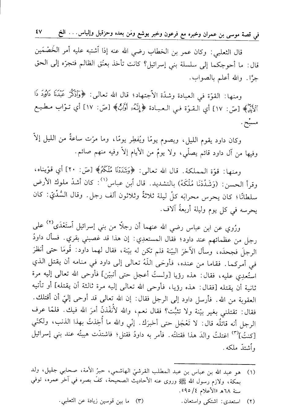 وروى عن ابن عباس رضي الله عنهما أن رجلاً من بني إسرائيل استعدى على رجل من عظمائهم عند داود ؛ فقال المستعدي : إن هذا قد غصبني بقرى . فسأل داود الرجل فجحده ، وسأل الآخر البينة فلم تكن له بينة ، فقال لهما داود : قوما حتى أنظر في أمركما . فقاما من عنده ، فأوحى الله تعالى إلى داود في منامه أن يقتل الذي استعدى عليه ، فقال : هذه رؤيا ولست أعجل حتى أتبين فأوحى الله تعالى إليه مرة ثانية أن يقتله فقال : هذه رؤيا ، فأوحى الله تعالى إليه مرة ثالثة أن يقتله أو تأتيه العقوبة من الله . فأرسل داود إلى الرجل فقال : إن الله تعالى قد أوحى إلي أن أقتلك . فقال : تقتلني بغير بينة ولا تثبت ؟ . فقال نعم ، والله لأنفذن أمر الله فيك . فلما عرف الرجل أنه قاتله قال : لا تعجل حتى أخبرك . إني والله ما أخذت بهذا الذنب ، ولكني كنت اغتلت والد هذا فقتلته . فأمر به داود فقتل ، فاشتد هيبته عند بني إسرائيل واشتد ملكه .