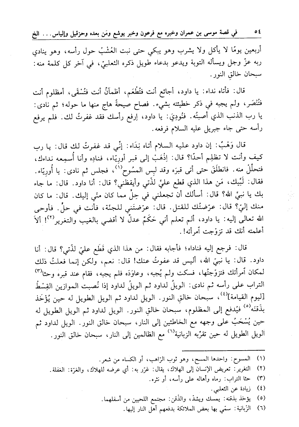 قال : فرجع إليه فناداه ؛ فأجابه فقال : من هذا الذي قطع علي لذتي ؟ قال : أنا داود . قال : يا نبي الله ، أليس قد عفوت عنك . قال : نعم ، ولكن إنما فعلت ذلك لمكان امرأتك فتزوجتها ، فسكت ولم يجبه ، وعاوده فلم يجبه ، فقام عند قبره وحثا التراب على رأسه ثم نادى : الويل لداود ثم الويل لداود إذا نصبت الموازين القسط ليوم القيامة ، سبحان خالق النور . الويل لداود ثم الويل الطويل له حين يؤخذ بذقنه فيدفع إلى المظلوم ، سبحان خالق النور . الويل لداود ثم الويل الطويل له حين يسحب على وجهه مع الخاطئين إلى النار ، سبحان خالق النور . الويل لداود ثم الويل الطويل له حين تقربه الزبانية مع الظالمين إلى النار ، سبحان خالق النور .