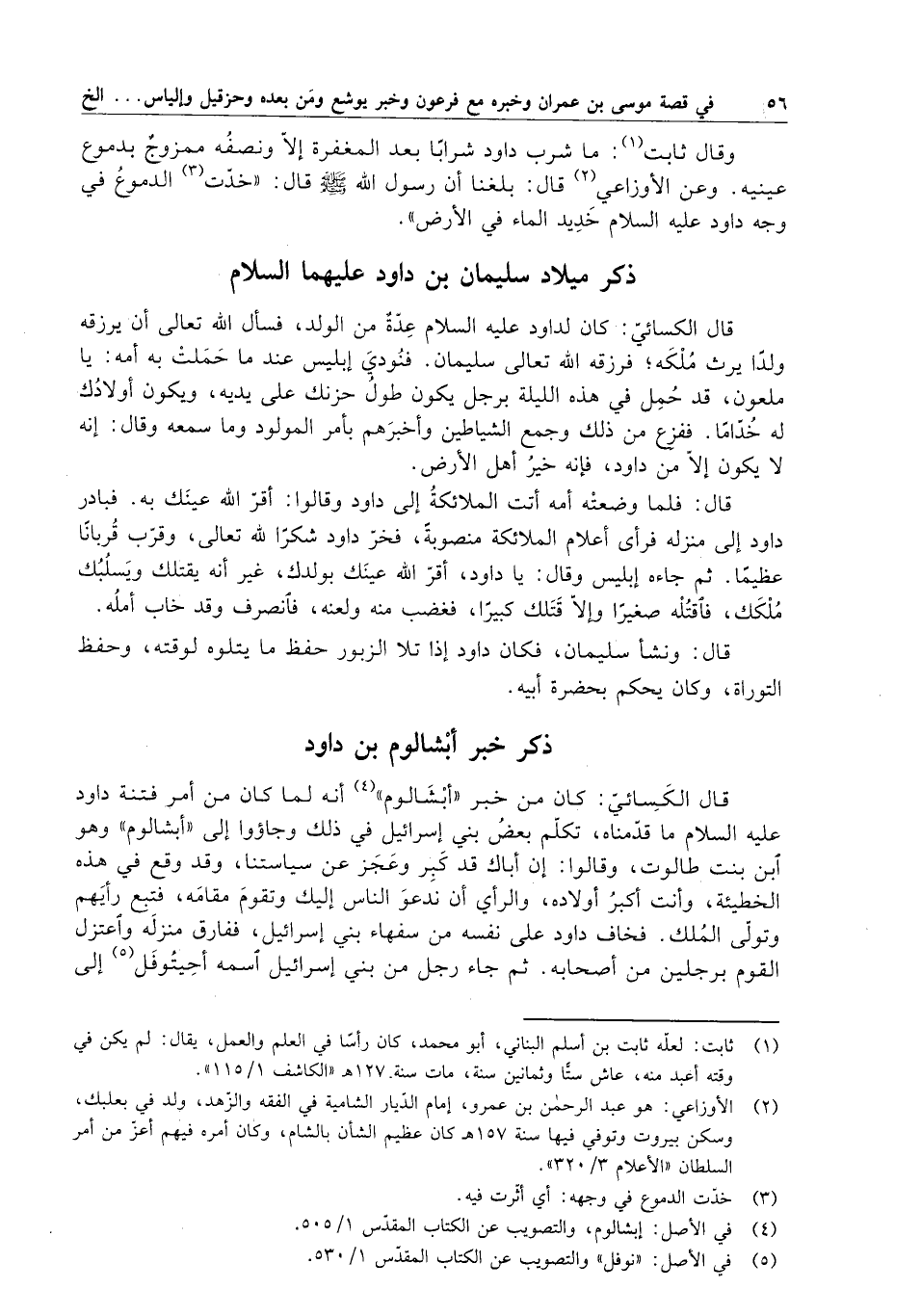قال : ونشأ سليمان ، فكان داود إذا تلا الزبور حفظ ما يتلوه لوقته ، وحفظ التوراة ، وكان يحكم بحضرة أبيه .
