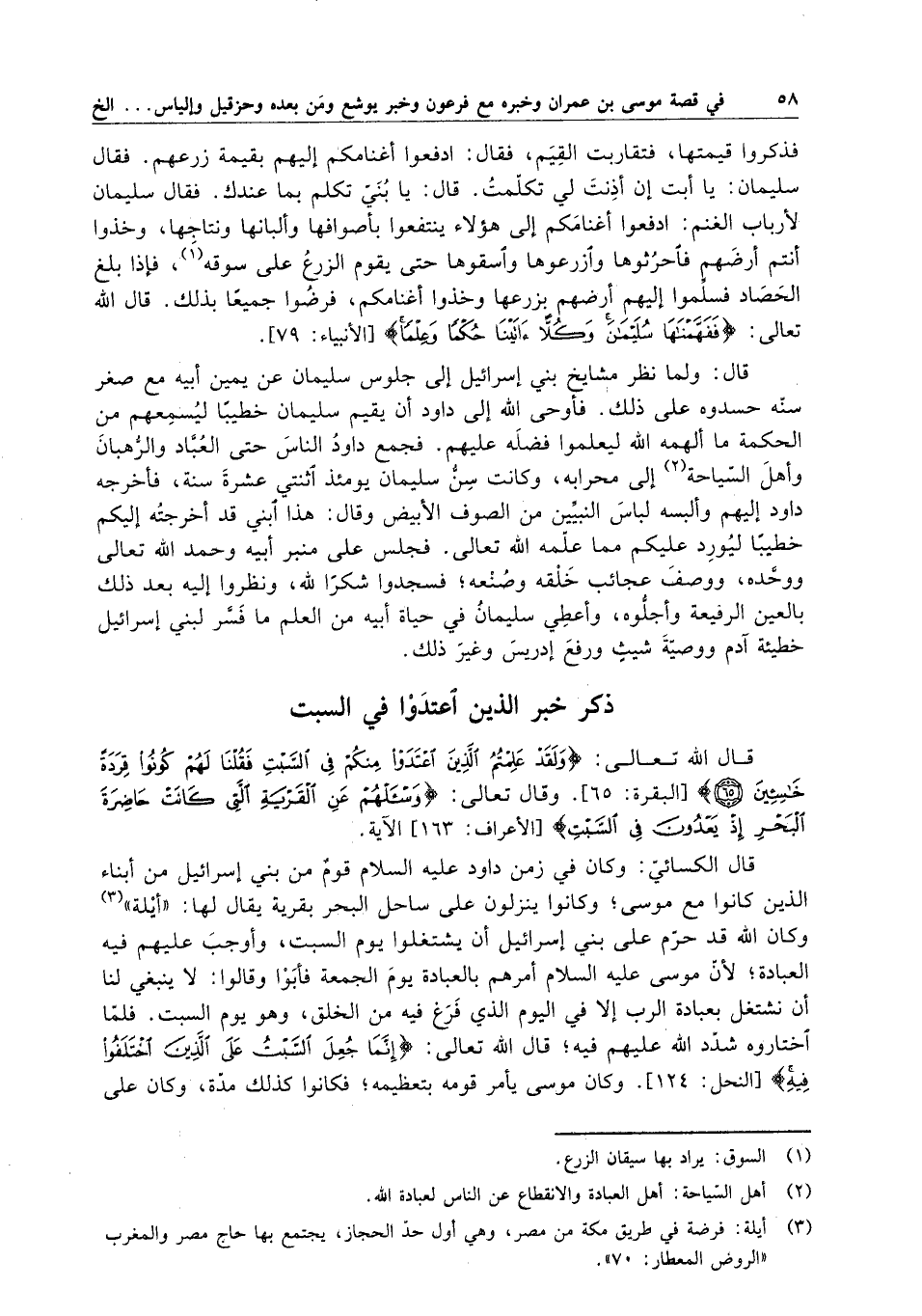 قال الله تعالى : " ولقد علمتم الذين اعتدوا منكم في السبت فقلنا لهم كونوا قردة خاسئين " . وقال تعالى : " واسألهم عن القرية التي كانت حاضرة البحر إذ يعدون في السبت " الآية . قال الكسائي : وكان في زمن داود - ع - قوم من بني إسرائيل من أبناء الذين كانوا مع موسى ؛ وكانوا ينزلون على ساحل البحر بقرية يقال لها : أيلة وكان الله قد حرم على بني إسرائيل أن يشتغلوا يوم السبت ، وأوجب عليهم فيه العبادة ؛ لأن موسى - ع - أمرهم بالعبادة يوم الجمعة فأبوا وقالوا : لا ينبغي لنا أن نستغل بعبادة الرب إلا في اليوم الذي فرغ فيه من الخلق ، وهو يوم السبت . فلما اختاروه شدد الله عليهم فيه ؛ قال الله تعالى : " إنما جعل السبت على الذين اختلفوا فيه " . وكان موسى يأمر قومه بتعظيمه ، فكانوا كذلك مدة ، وكان على