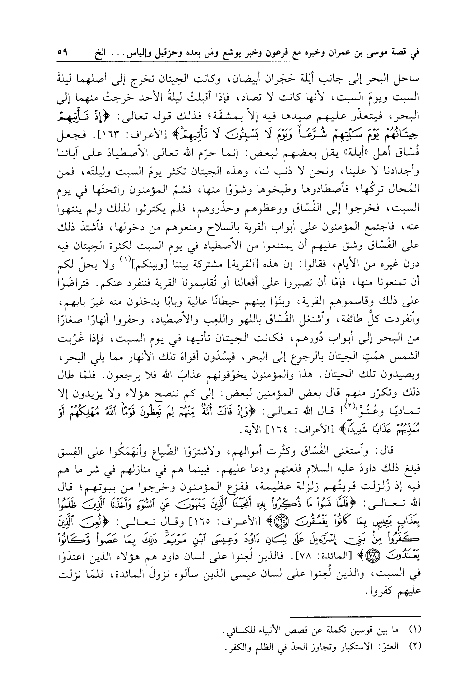 ساحل البحر إلى جانب أيلة حجران أبيضان ، وكانت الحيتان تخرج إلى أصلهما ليلة السبت ويوم السبت ، لأنها كانت لا تصاد ، فإذا أقبلت ليلة الأحد خرجت منهما إلى البحر ، فيتعذر عليهم صيدها فيه إلا بمشقة ؛ فذلك قوله تعالى : " إذ تأتيهم حيتانهم يوم سبتهم شرعاً ويوم لا يسبتون لا تأتيهم " . فجعل فساق أهل أيلة يقول بعضهم لبعض : إنما حرم الله تعالى الاصطياد على آبائنا وأجدادنا لا علينا ، ونحن لا ذنب لنا ، وهذه الحيتان تكثر يوم السبت وليلته ، فمن المحال تركها ؛ فاصطادوها وطبخوها وشووا منها ، فشم المؤمنون رائحتها في يوم السبت ، فخرجوا إلى الفساق ووعظوهم وحذروهم ، فلم يكترثوا لذلك ولم ينتهوا عنه ، فاجتمع المؤمنون على أبواب القرية بالسلاح ومنعوهم من دخولها ، فاشتد ذلك على الفساق وشق عليهم أن يمتنعوا من الاصطياد في يوم السبت لكثرة الحيتان فيه دون غيره من الأيام ، فقالوا : إن هذه القرية مشتركة بيننا وبينكم ولا يحل لكم أن تمنعونا منها ، فإما أن تصبروا على أفعالنا أو تقاسمونا القرية فننفرد عنكم . فتراضوا على ذلك وقاسموهم القرية ، وبنوا بينهم حيطاناً عالية وباباً يدخلون منه غير بابهم ، وانفردت كل طائفة ، واشتغل الفساق باللهو واللعب والاصطياد ، وحفروا أنهاراً صغاراً من البحر إلى أبواب دورهم ، فكانت الحيتان تأتيهم في يوم السبت ، فإذا غربت الشمس همت الحيتان بالرجوع إلى البحر ، فيسدون أفواه تلك الأنهار مما يلي البحر ، ويصيدون تلك الحيتان . هذا والمؤمنون يخوفونهم عذاب الله فلا يرجعون . فلما طال ذلك وتكرر منهم قال بعض المؤمنين لبعض : إلى كم ننصح هؤلاء ولا يزيدون إلا تمادياً وعتواً قال الله تعالى : " وإذا قالت أمة منهم لم تعظون قوماً الله مهلكهم أو معذبهم عذاباً شديداً " الآية .