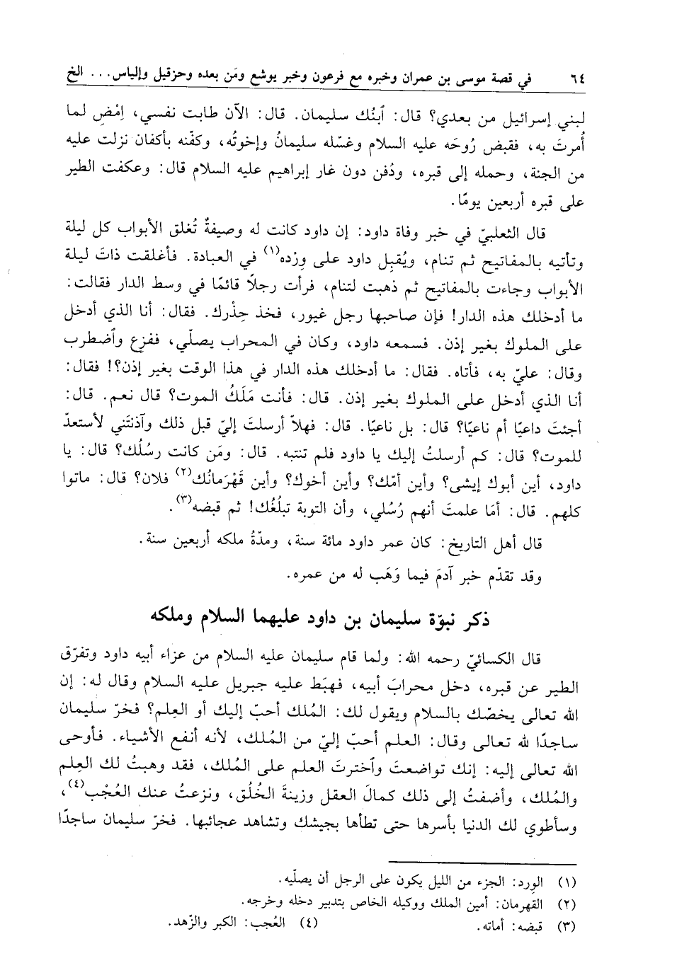 قال الثعلبي في خبر وفاة داود : إن داود كانت له وصيفة تغلق الأبواب كل ليلة وتأتيه بالمفاتيح ثم تنام ، ويقبل داود على ورده في العبادة . فأغلقت ذات ليلة الأبواب وجاءت بالمفاتيح ثم ذهبت لتنام ، فرأت رجلاً قائماً في وسط الدار فقالت : ما أدخلك هذه الدار فإن صاحبها رجل غيور ، فخذ حذرك . فقال : أنا الذي أدخل على الملوك بغير إذن . فسمعه داود ، وكان في المحراب يصلي ، ففزع واضطرب وقال : علي به ، فأتاه . فقال : ما أدخلك في هذه الدار في هذا الوقت بغير إذن ؟ فقال : أنا الذي أدخل على الملوك بغير إذن . قال : فأنت ملك الموت ؟ قال نعم . قال : أجئت داعياً أم ناعياً ؟ قال : بل ناعياً . قال : فهلا أرسلت إلي قبل ذلك وآذنتني لأستعد للموت ؟ قال : كم أرسلت إليك يا داود فلم تنتبه . قال : ومن كانت رسلك ؟ قال : يا داود ، أين أبوك إيش ؟ وأين أمك ؟ وأين أخوك ؟ وأين قهر مانك فلان ؟ قال : ماتوا كلهم . قال : أما علمت أنهم رسلي ، وأن النوبة تبلغك ثم قبضه .