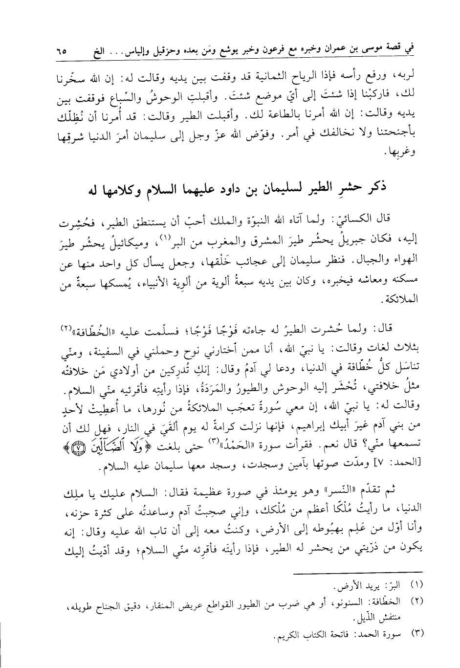 قال : ولما حشر الطير جاءته فوجاً فوجاً ؛ فسلمت عليه الخطافة بثلاث لغات وقالت : يا نبي الله ، أنا ممن اختارني نوح وحملني في السفينة ، ومني تناسل كل خطافة في الدنيا ، ودعا لي آدم وقال : إنك تدركين من أولادي من خلافته مثل خلافتي ، تحشر إليه الوحوش والطيور والمردة ، فإذا رأيته فأقرئيه مني السلام . وقالت له : يا نبي الله ، إن معي سورة تعجب الملائكة من نورها ، ما أعطيت لأحد من بني آدم غير أبيك إبراهيم ، فإنها نزلت كرامة له يوم ألقى في النار ، فهل لك أن تسمعها مني ؟ قال نعم . فقرأت سورة الحمد حتى بلغت " ولا الضالين " ومدت صوتها بآمين وسجدت ، وسجد معها سليمان - ع - .