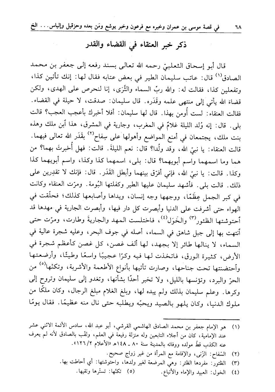 قال أبو إسحاق الثعلبي رحمه الله تعالى بسند رفعه إلى جعفر بن محمد الصادق قال : عاتب سليمان الطير في بعض عتابه فقال لها : إنك تأتين كذا ، وتفعلين كذا ، فقالت له : والله رب السماء والثرى ، إنا لنحرص على الهدى ، ولكن قضاء الله يأتي إلى منتهى علمه وقدره . قال سليمان : صدقت ، لا حيلة في القضاء . فقالت العنقاء : لست أومن بهذا . قال لها سليمان : أفلا أخبرك بأعجب العجب ؟ قالت بلى . قال : إنه ولد الليلة غلام في المغرب ، وجارية في المشرق ، هذا ابن ملك وهذه بنت ملك ، يجتمعان في أمنع المواضع وأهولها على سفاح بقدر الله تعالى فيهما . قالت العنقاء : يا نبي الله ، وقد ولدا ؟ قال : نعم الليل . قالت : فهل أخبرت بهم ؟ من هما وما اسمهما واسم أبويهما ؟ قال : بلى ، اسمهما كذا وكذا ، واسم أبويهما كذا وكذا . قالت : يا نبي الله ، فإني أفرق بينهما وأبطل القدر . قال : فإنك لا تقدرين على ذلك . قالت بلى . فأشهد سليمان عليها الطير وكفلتها البومة . ومرت العنقاء وكانت في كبر الجمل عظماً ، ووجهها وجه إنسان ، ويداها وأصابعها كذلك ؛ فحلقت في الهواء حتى أشرفت على الدنيا وأبصرت كل دار فيها ، وأبصرت الجارية وطارت ، ومرت حتى انتهت بها إلى جبل شاهق في السماء ، أصله في جوف البحر ، وعليه شجرة عالية في السماء ، لا ينالها طائر إلا بجهد ، لها ألف غصن ، كل غصن كأعظم شجرة في الأرض ، كثيرة الورق ، فاتخذت لها فيه وكرا عجيباً واسعاً وطيئاً ، وأرضعتها واحتضنتها تحت جناحها ، وصارت تأتيها بأنواع الأطعمة والأشربة ، وتكنها من الحر والبرد ، وتؤنسها بالليل ، ولا تخبر أحداً بشأنها ، وتغدو إلى سليمان وتروح إلى وكرها . وعلم سليمان بذلك ولم يبده لها ، وبلغ الغلام مبلغ الرجل ، وكان ملكاً من ملوك الدنيا ، وكان يلهو بالصيد ويحبه ويطلبه حتى نال منه عظيماً . فقال يوماً