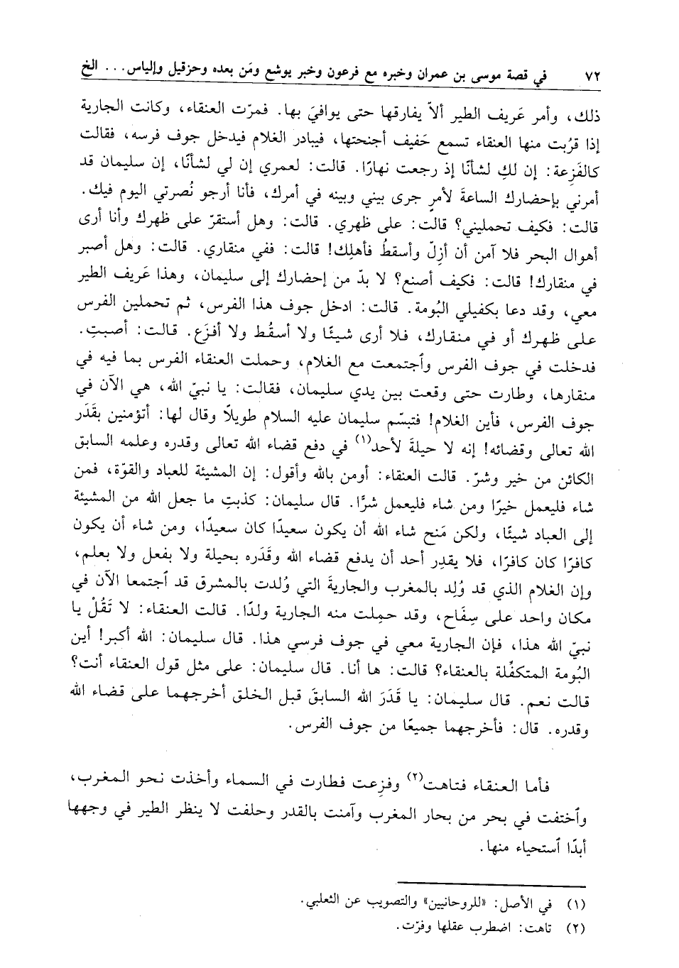 ذلك ، وأمر عريف الطير ألا يفارقها حتى يوافي بها . فمرت العنقاء ، وكانت الجارية إذا قربت منها العنقاء تسمع حفيف أجنحتها ، فيبادر الغلام فيدخل جوف فرسه ، فقالت كالفزعة : إن لك لشأناً إذ رجعت نهاراً . قالت : لعمري إن لي لشأناً ، إن سليمان قد أمرني بإحضارك الساعة لأمر جرى بين وبينه في أمرك ، فأنا أرجو نصرتي اليوم فيك . قالت : فكيف تحمليني ؟ قالت : على ظهري . قالت : وهل أستقر على ظهرك وأنا أرى أهوال البحر فلا آمن أن أزل وأسقط فأهلك قالت : ففي منقاري . قالت : وهل أصبر في منقارك قالت : فكيف أصنع ؟ لا بد من إحضارك إلى سليمان ، وهذا عريف الطير معي ، وقد دعا بكفيلي البومة . قالت : أدخل جوف هذا الفرس ، ثم تحملين الفرس على ظهرك أو في منقارك ، فلا أرى شيئاً ولا أسقط ولا أفزع . قالت : أصبت . فدخلت في جوف الفرس واجتمعت مع الغلام ، وحملت العنقاء الفرس بما فيه في منقارها ، وطارت حتى وقعت بين يدي سليمان ، فقالت : يا نبي الله ، هي الآن في جوف الفرس ، فأين الغلام فتبسم سليمان - ع - طويلاً وقال لها : أتؤمنين بقدر الله تعالى وقضائه إنه لا حيلة لأحد في دفع قضاء الله تعالى وقدره وعلمه السابق الكائن من خير وشر . قالت العنقاء : أومن بالله وأقول : إن المشيئة للعباد والقوة ، فمن شاء فليعمل خيراً ومن شاء فليعمل شراً . قال سليمان : كذبت ما جعل الله من المشيئة إلى العباد شيئاً ، ولكن من شاء الله أن يكون سعيداً كان سعيداً ، ومن شاء أن يكون كافراً كان كافراً ، فلا يقدر أحد أن يدفع قضاء الله وقدره بحيلة ولا بفعل ولا بعلم ، وإن الغلام الذي قد ولد بالمغرب والجارية التي ولدت بالمشرق قد اجتمعا الآن في مكان واحد على سفاح ، وقد حملت منه الجارية ولداً . قالت العنقاء : لا تقل يا نبي الله هذا ، فإن الجارية معي في جوف فرسي هذا . قال سليمان : الله أكبر أين البومة المتكفلة بالعنقاء ؟ قالت : هأنا . قال سليمان : على مثل قول العنقاء أنت ؟ قالت نعم . قال سليمان : يا قدر الله السابق قبل الخلق أخرجهما على قضاء الله وقدره . قال : فأخرجهما جميعاً من جوف الفرس .