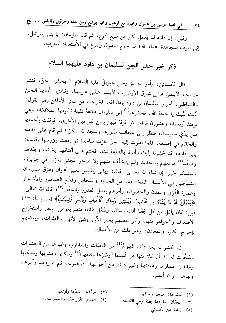 قال الكسائي : وأمر الله عز و جل جبريل - ع - أن يحشر الجن ، فنشر جناحه الأيمن على شرق الأرض ، والأيسر على غربها ، ونادى : أيتها الجن والشياطين ، أجيبوا سليمان بن داود بإذن الله ، فخرجت من سائر الأماكن وهي تقول : لبيك لبيك يا حجة الله . فحشرها إلى سليمان طائعة ذليلة تسوقها الملائكة ، وهي يومئذ أربعمائة وعشرون فرقة ، كل فرقة تدين بدين غير دين الأخرى ، فوقفت بأجمعها بين يدي سليمان ، فنظر إلى عجائب صورها وسجد لله شكراً ؛ ثم قام على قدميه والخاتم في إصبعه ، فلما نظرت إليه الجن خرت ساجدة ثم رفعت رءوسها وقالت : يا بن داود ، قد حشرنا إليك وأمرنا بالطاعة لك ، فختم على أكتافهم بخاتمه وجندهم وصفد مردتهم بالحديد ولم يتخلف منهم إلا صخر الجني تغيب في جزيرة ، وسنذكر خبره إن شاء الله تعالى . قال : وبقي إبليس بغير أعوان وفرق سليمان الشياطين في الأعمال المختلفة . من الحديد والنحاس وقطع الصخور والأشجار وعمارة القرى والمدن والحصون ، وأمرهم بعمل القدور والجفان ؛ قال الله تعالى : " يعملون له ما يشاء من محاريب وتماثيل وجفان كالجواب وقدور راسيات " . قيل : كان يأكل من كل جفنة ألف إنسان . وشغل طائفة منهم يغوص البحار واستخراج الأصداف والجواهر منها ، وأمر بعضهم بحفر الآبار وشق الأنهار والقنوات ، وبعضهم بإخراج الكنوز والمعادن ، وغير ذلك من الأعمال .