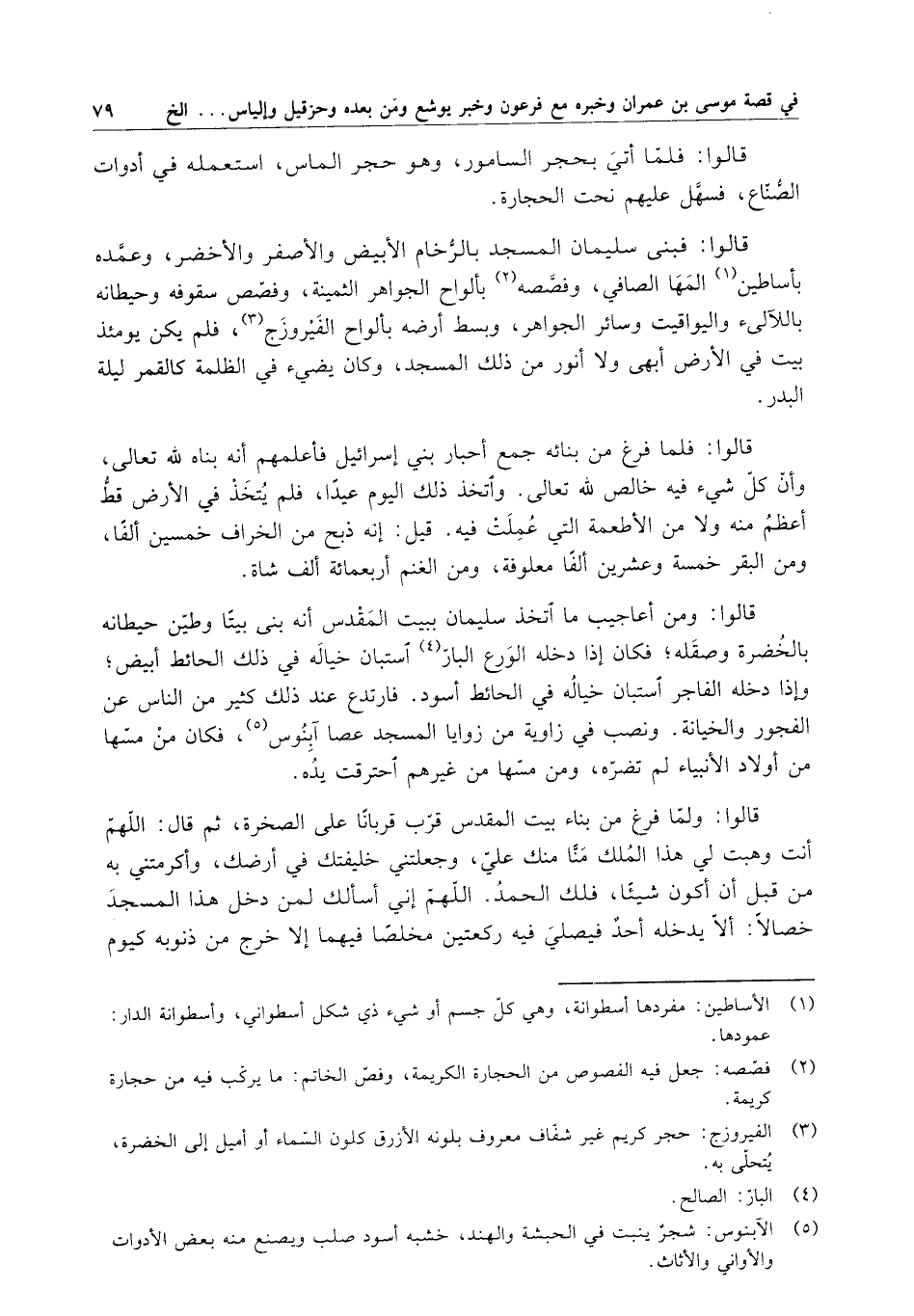 قالوا : فبنى سليمان المسجد بالرخام الأبيض والأصفر والأخضر ، وعمده بأساطين المها الصافي ، وفصصه بألواح الجواهر الثمينة ، وفصص سقوفه وحيطانه باللآلئ واليواقيت وسائر الجواهر ، وبسط أرضه بألواح الفيروزج ، فلم يكن يومئذ بيت في الأرض أبهى ولا أنور من ذلك المسجد ، وكان يضيء في الظلمة كالقمر ليلة البدر . قالوا : فلما فرغ من بنائه جمع أحبار بني إسرائيل فأعلمهم أنه بناه لله تعالى ، وأن كل شيء فيه خالص لله تعالى . واتخذ ذلك اليوم عيداً ، فلم يتخذ في الأرض قط أعظم منه ولا من الأطعمة التي عملت فيه . قيل : إنه ذبح من الخراف خمسين ألفاً ، ومن البقر خمسة وعشرين ألفاً معلوفة ، ومن الغنم أربعمائة ألف شاة .