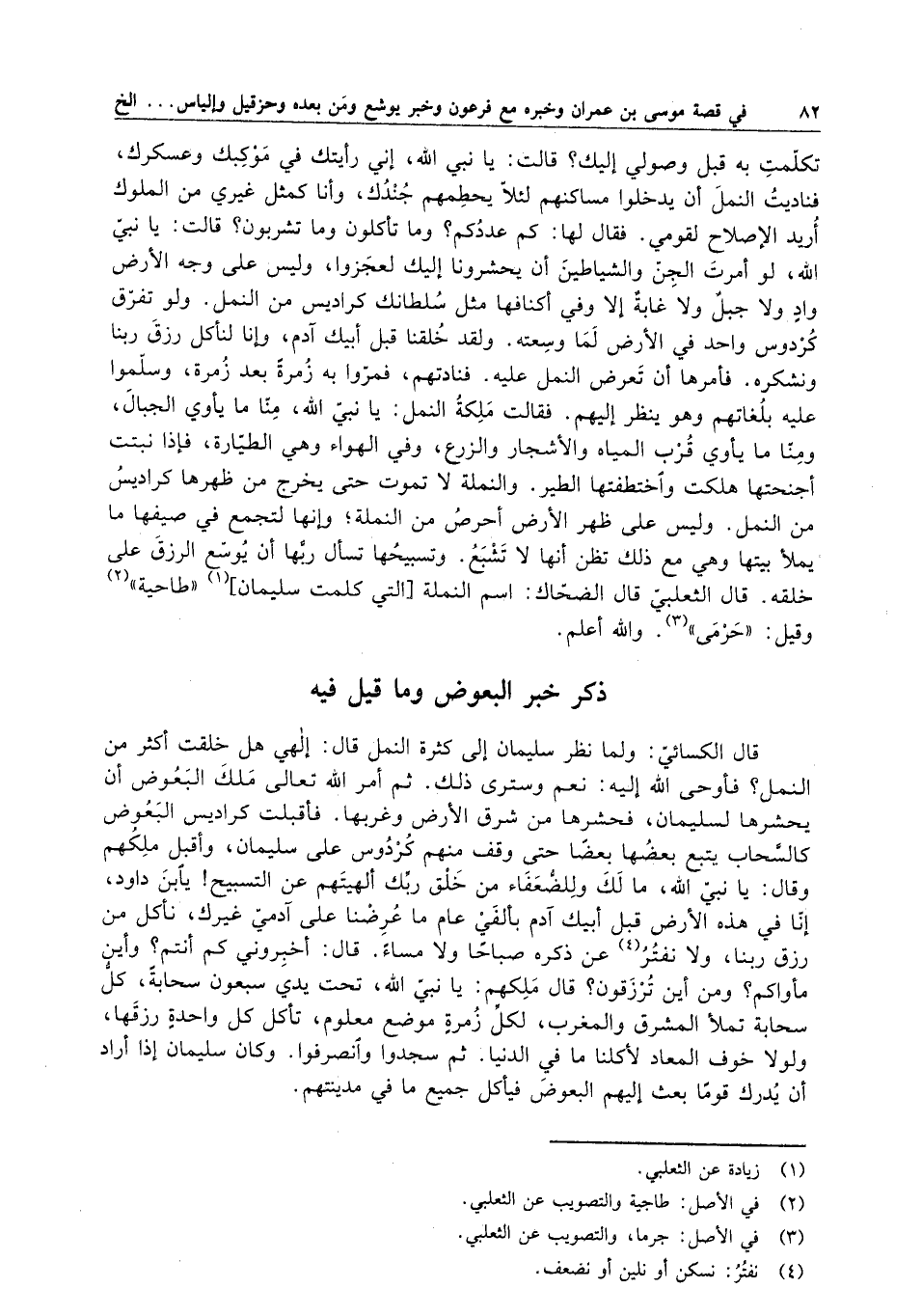 قال الكسائي : ولما نظر سليمان إلى كثرة النمل قال : إلهي هل خلقت أكثر من النمل ؟ فأوحى الله إليه : نعم وسترى ذلك . ثم أمر الله تعالى ملك البعوض أن يحشرها لسليمان ، فحشرها من شرق الأرض وغربها . فأقبلت كراديس البعوض كالسحاب يتبع بعضها بعضاً حتى وقف منهم كردوس على سليمان ، وأقبل ملكهم وقال : يا نبي الله ، مالك وللضعفاء من خلق ربك ألهيتهم عن التسبيح ؟ ؟ ؟ ؟ ؟ . يا بن داود ، إنا في هذه الأرض قبل أبيك آدم بألفي عام ما عرضنا على آدمي غيرك ، نأكل من رزق ربنا ، ولا نفتر عن ذكره صباحاً ولا مساء . قال : أخبروني كم أنتم ؟ وأين مأواكم ؟ ومن أين ترزقون ؟ قال ملكهم : يا نبي الله ، تحت يدي سبعون سحابة ، كل سحابة تملأ المشرق والمغرب ، لكل زمرة موضع معلوم ، تأكل كل واحدة رزقها ، ولولا خوف المعاد لأكلنا ما في الدنيا . ثم سجدوا وانصرفوا . وكان سليمان إذا أراد أن يدرك قوماً بعث إليهم البعوض فيأكل جميع ما في مدينتهم .