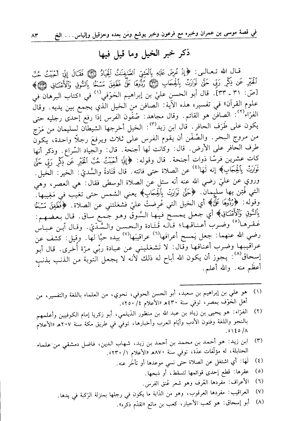 قال الله تعالى : " إذ عرض عليه بالعشي الصافنات الجياد ، فقال إني أحببت حب الخير عن ذكر ربي حتى توارت بالحجاب ردوها علي فطفق مسحاً بالسوق والأعناق " . قال أبو الحسن علي بن إبراهيم الحوفي في كتاب البرهان في علوم القرآن في تفسيره هذه الآية : الصافن من الخيل الذي يجمع بين يديه . وقال الفراء : الصافن هو القائم . وقال مجاهد : صفون الفرس إذا رفع رجليه حتى يكون عى طرف الحافر قال ابن زيد : أخرجها الشيطان لسليمان من مرج من مروج البحر . والصفن أن يقوم الفرس على ثلاث ويرفع رجلاً واحدة ، يكون طرف الحافر على الأرض . قال : وكانت لها أجنحة . قال : والجياد السراع . وذكر أنها كانت عشرين فرساً ذوات أجنحة . قال وقوله : " إني أحببت حب الخير عن ذكر ربي حتى توارت بالحجاب " إنه لها عن الصلاة حتى فاتته . قال قتادة والسدي : الخير : الخيل . وروي عن علي رضي الله عنه أنه سئل عن الصلاة الوسطى فقال : هي العصر ، وهي التي فتن بها سليمان . " حتى توارت بالحجاب " ، يعني الشمس حتى تغيب في مغيبها . وقوله " ردوها علي " أي الخيل التي عرضت علي فشغلتني عن الصلاة . " فطفق مسحاً بالسوق والأعناق " ، أي جعل يمسح فهيا السوق وهو جمع ساق . قال بعضهم : عقرها وضرب أعناقها ؛ قاله قتادة والحسن والسدي . وقال ابن عباس رضي الله عنهما : جعل يمسح أعرافها وعراقيبها بيده حباً لها . وقيل : كشف عن عراقيبها وضرب أعناقها وقال : لا تشغليني عن عبادة ربي مرة أخرى . قال أبو إسحاق : يجوز أن يكون الله أباح له ذلك لأنه لا يجعل التوبة من الذنب بذنب أعظم منه . والله أعلم .