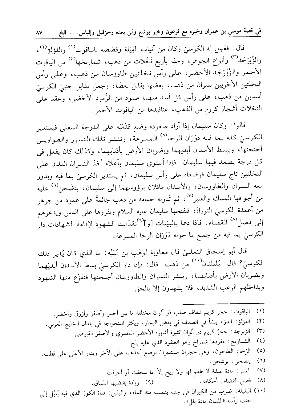 قال : فعمل له الكرسي وكان من أنياب الفيلة وفصصه بالياقوت واللؤلؤ ، والزبرجد وأنواع الجوهر ، وحفه بأربع نخلات من ذهب ، شماريخها من الياقوت الأحمر والزبرجد الأخضر ، على رأس نخلتين طاووسان من ذهب ، وعلى رأس النخلتين الأخريين نسران من ذهب ، بعضها يقابل بعضاَ ، وجعل مقابل جنبي الكرسي أسدين من ذهب ، على رأس كل أسد منهما عمود من الزمرد الأخضر ، وعقد على النخلات أشجار كروم من الذهب ، عناقيدها من الياقوت الأحمر . قالوا : وكان سليمان إذا أراد صعوده وضع قدميه على الدرجة السفلى فيستدير الكرسي كله بما فيه دوران الرحا المسرعة ، وتنشر تلك النسور والطواويس أجنحتها ، ويبسط الأسدان أيديهما ويضربان الأرض بأذنابهما ، وكذلك كان يفعل في كل درجة يصعد فيها سليمان . فإذا استوى سليمان بأعلاه أخذ النسران اللذان على النخلتين تاج سليمان فوضعاه على رأس سليمان ، ثم يستدير الكرسي بما فيه ويدور معه النسران والطاووسان ، والأسدان ماثلان برءوسهما إلى سليمان ، ينضحن عليه من أجوافها المسك والعنبر ، ثم تناوله حمامة من ذهب جاثمة على عمود من جوهر من أعمدة الكرسي النوارة ، فيفتحها سليمان - ع - ويقرؤها على الناس ويدعوهم إلى فصل القضاء . فإذا دعا بالبينات وتقدمت الشهود لإقامة الشهادات دار الكرسي بما فيه من جميع ما حوله دوران الرحا المسرعة .