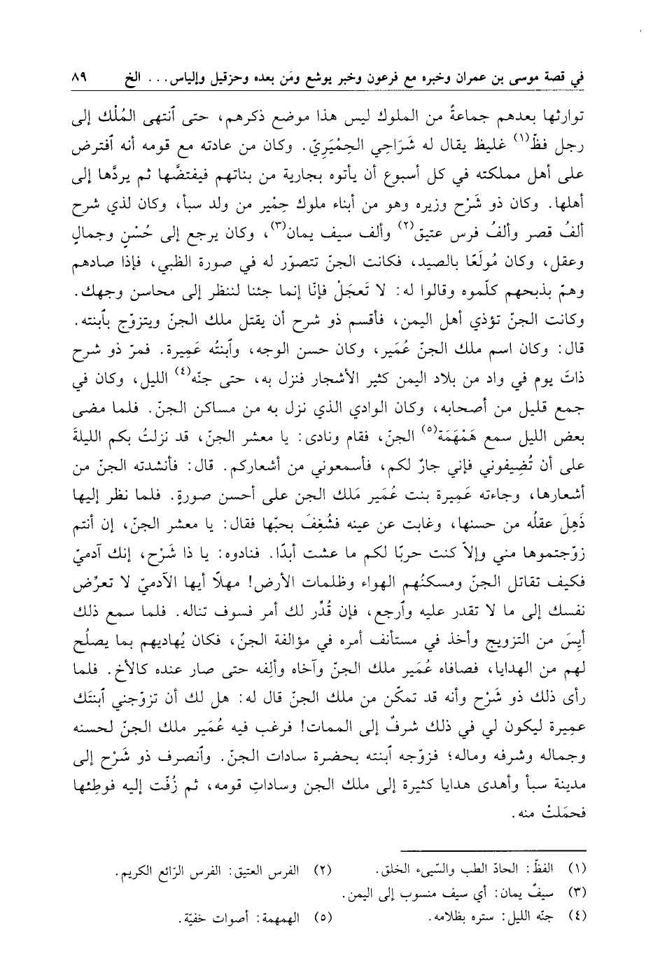 توارثها بعدهم جماعة من الملوك ليس هذا موضع ذكرهم ، حتى انتهى الملك إلى رجل فظ غليظ يقال له شراحي الحميري . وكان من عادته مع قومه أنه افترض على أهل مملكته في كل أسبوع أن يأتوه بجارية من بناتهم فيفتضها ثم يردها إلى أهلها . وكان ذو شرح وزيره وهو من أبناء ملوك حمير من ولد سبأ ، وكان لذي شرح ألف قصر وألف فرس عتيق وألف سيف يمان ، وكان يرجع إلى حسن وجمال وعقل ، وكان مولعاً بالصيد ، فكانت الجن تتصور له في صورة الظبي ، فإذا صادهم وهم بذبحهم كلموه وقالوا له : لا تعجل فإنا إنما جئنا لننظر إلى محاسن وجهك . وكانت الجن تؤذي أهل اليمن ، فأقسم ذو شرح أن يقتل ملك الجن ويتزوج بابنته . قال وكان اسم ملك الجن عمير ، وكان حسن الوجه ، وابنته عميرة . فمر ذو شرح ذات يوم في واد من بلاد اليمن كثير الأشجار فنزل به ، حتى جنه الليل ، وكان في جمع قليل من أصحابه ، وكان الوادي الذي نزل به من مساكن الجن . فلما مضى بعض الليل سمع همهمة الجن ، فقام ونادى : يا معشر الجن ، قد نزلت بكم الليلة على أن تضيفوني فإني جار لكم ، فأسمعوني من أشعاركم . قال : فأنشدته الجن من أشعارها ، وجاءته عميرة بنت عمير ملك الجن على أحسن صورة . فلما نظر إليها ذهل عقله من حسنها ، وغابت عن عينه فشغف بحبها فقال : يا معشر الجن ، إن أنتم زوجتموها مني وإلا كنت حرباً لكم ما عشت أبداً . فنادوه : يا ذا شرح ، إنك آدمي فكيف تقاتل الجن ومسكنهم الهواء وظلمات الأرض مهلاً أيها الآدمي لا تعرض نفسك إلى ما لا تقدر عليه وارجع ، فإن قدر لك أمر فسوف تناله . فلما سمع ذلك أيس من التزويج وأخذ في مستأنف أمره في مؤالفة الجن ، فكان يهاديهم بما يصلح لهم من الهدايا ، فصافاه عمير ملك الجن وأخاه وألفه حتى صار عنده كالأخ . فلما رأى ذلك ذو شرح وأنه قد تمكن من ملك الجن قال له : هل لك أن تزوجني ابنتك عميرة ليكون لي في ذلك شرف إلى الممات فرغب فيه عمير ملك الجن لحسنه وجماله وشرفه وماله ؛ فزوجه ابنته بحضرة سادات الجن . وانصرف ذو شرح إلى مدينة سبأ وأهدى هدايا كثيرة إلى ملك الجن وسادات قومه ، ثم زفت إليه فوطئها فحملت منه .